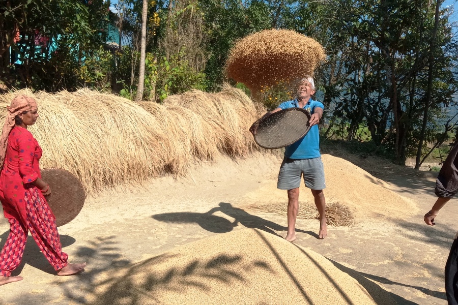 इलाम– सूर्योदय नगरपालिका–१ मकरजुङका टीकाराम अधिकारीले यस वर्ष पोहोरभन्दा तीन मुरी बढी धान फलाए। “अघिल्लो साल १५ मुरी फलेको ठाउँमा यो साल १८ मुरी थन्क्याएँ। चियामा मूल्य छैन। अब जसोतसो धानमै बल गर्ने बेला भयो”, अधिकारीले भने।