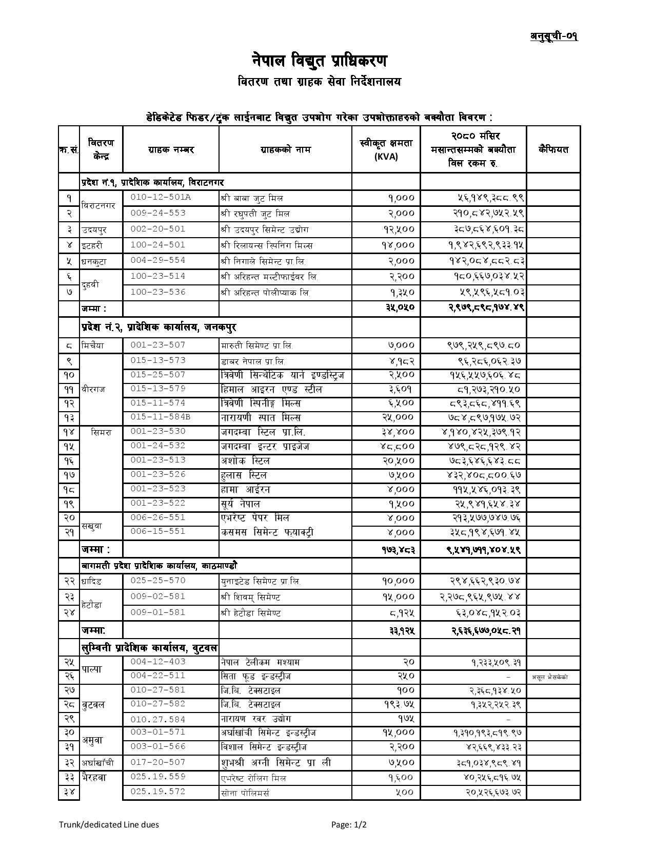 प्राधिकरणले शुक्रबार सिमरास्थित जगदम्बा स्टिल, विराटनगरस्थित रिलायन्स स्पिनिङ मिल्स, दाङस्थित घोराही सिमेन्ट र भैरहवास्थित अर्घाखाँची सिमेन्ट उद्योगको लाइन काटेको थियो भने आइतबार सर्वोत्तम सिमेन्ट, लक्ष्मी स्टिल, त्रिवेणी स्पिनिङ मिल्स, अशोक स्टिल र सोनापुर मिनरल्स एन्ड आयल उद्योगको लाइन काटेको थियो।