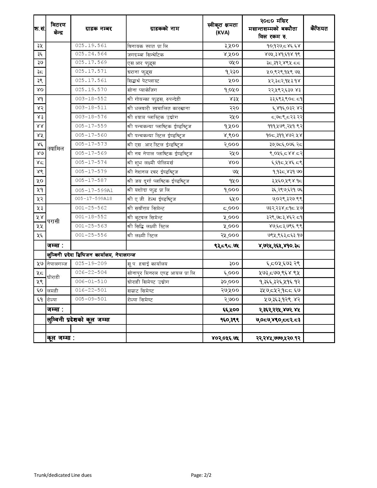 प्राधिकरणका अनुसार डेडिकेटेड तथा ट्रंकलाइनबाट विद्युत् उपभोग गरेको कुल ६१ वटा उपभोक्ताहरूको मंसिर मसान्तसम्म बक्यौता रकम २२ अर्ब २४ करोड रुपैयाँ छ। यसमध्ये लाइन काटिएका ९ उद्योगहरूको मात्र १२ अर्ब ५० करोड रुपैयाँ बक्यौता रकम रहेको प्राधिकरणले जनाएको छ। यी हुन् बक्यौता तिर्न बाँकी रहेका उद्योगहरू: