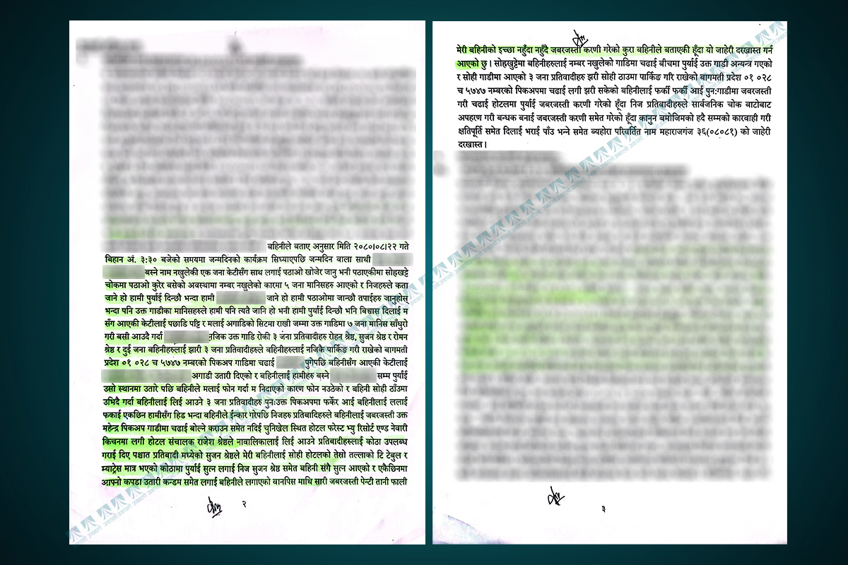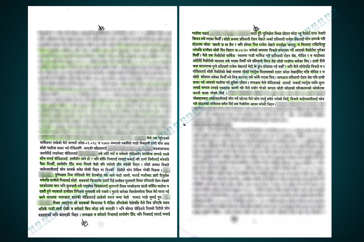 उनको बुझाइलाई पीडितको कागजले पनि समर्थन गर्छ। “प्रतिवादीहरू उक्त पिकअप गाडी (सुजनको स्करपियो) मा फर्केर आई मलाई ललाई फकाई एकछिन हामीसँग हिँड भन्दा मैले इन्कार गरेपछि निज प्रतिवादीहरूले मलाई जबरजस्ती गाडीमा चढाई बोल्न कराउन समेत नदिई होटल पुर्याएका थिए,” उनले गराएको वयान कागजमा उल्लेख छ।