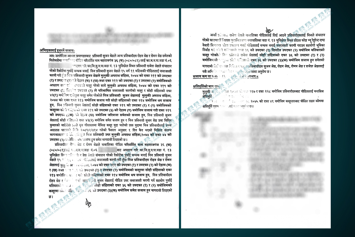 काठमाडौँ– नाबालिगलाई बन्धक बनाएर बलात्कार गरी पैसा दिएर घटना सामसुम पार्न खोज्ने सुजन श्रेष्ठ समेतविरुद्ध काठमाडौँ जिल्ला अदालतमा मुद्दा दायर भएको छ। १५ वर्षकी नाबालिग (प्रहरीले दिएको नाम महाराजगञ्ज–३६) लाई बन्धक बनाई बलात्कार गर्ने ३५ वर्षीय सुजन श्रेष्ठको थुनछेक प्रयोजनका लागि न्यायाधीश दिनबन्धु बरालको इजलाशमा बहस जारी छ।