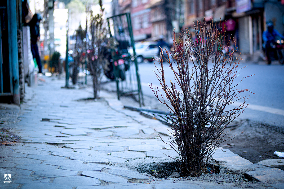 काठमाडौँ महानगरपालिकाले शहरमा हरियाली बढाउन रोपेका बिरुवा स्याहारसुसार नपाएर मर्न थालेका छन्। मानिस हिँड्ने बाटोसमेत नराखेर रोपिएका बिरुवा केही उखेलिएका, केही मलजलको अभावमा मर्न थालेका त केही झारले छोपिएका छन्।