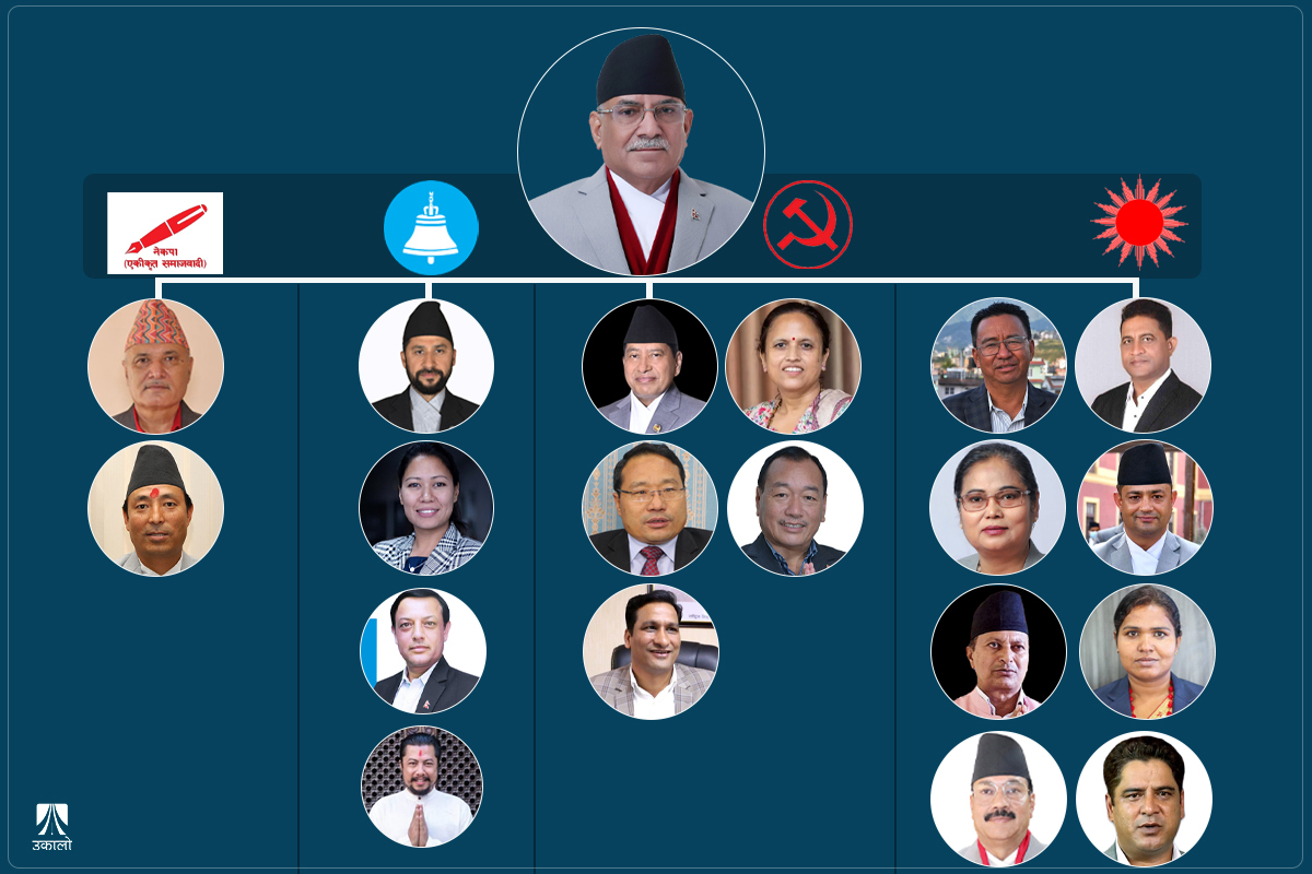 प्रधानमन्त्री दाहालको सचिवालयका अनुसार एमालेका ८, माओवादी केन्द्रका ५, राष्ट्रिय स्वतन्त्र पार्टीका ४ र एकीकृत समाजवादीका २ गरी मन्त्रिपरिषद् २० सदस्यीय भएको छ।