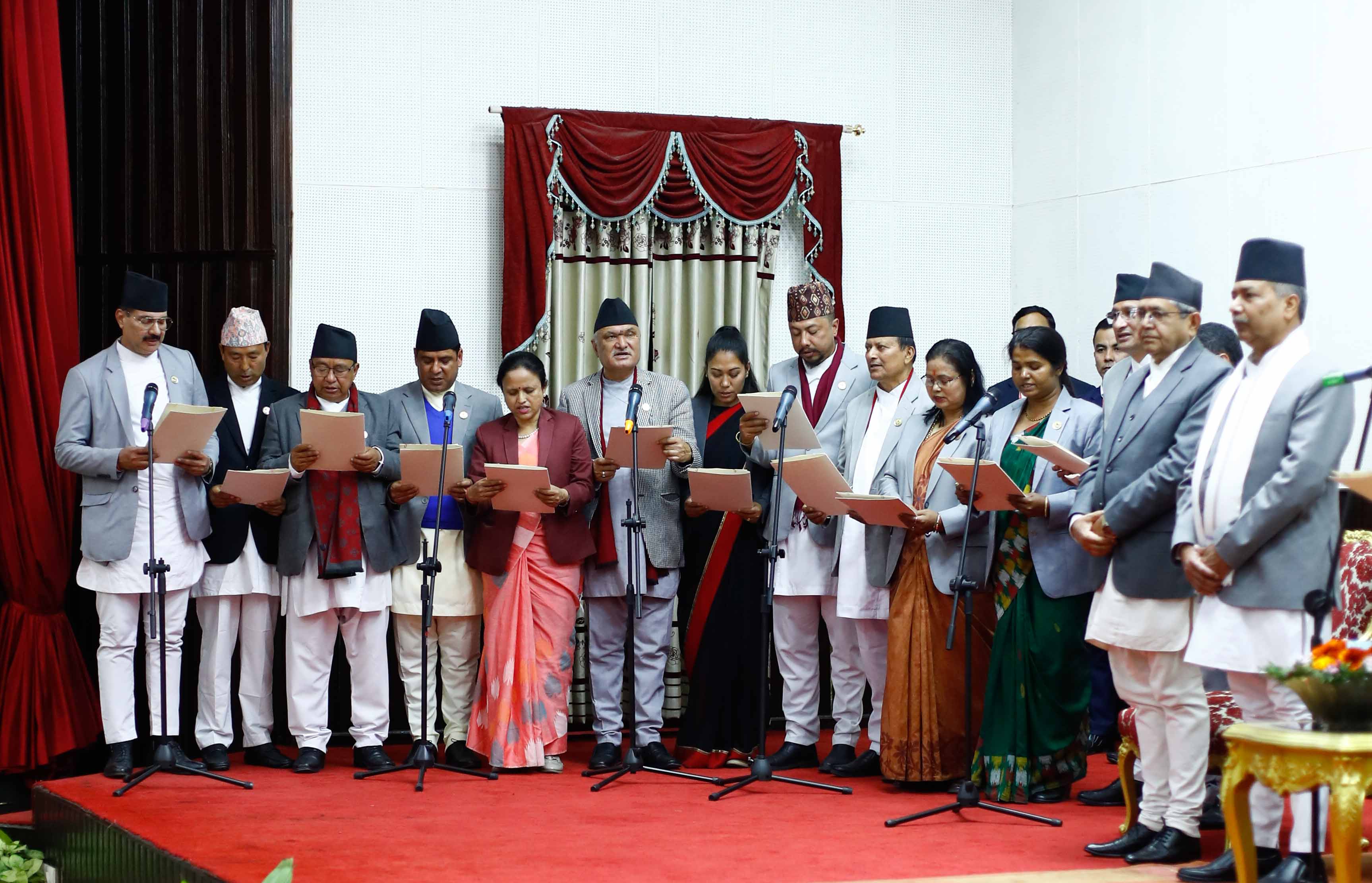 राष्ट्रपति रामचन्द्र पौडेलले तीन उपप्रधानमन्त्रीसहित १६ नवनियुक्त मन्त्रीलाई पद तथा गोपनीयताको शपथ गराएका छन्। यसअघि पहिलो चरणमा विनाविभागीय मन्त्रीका रूपमा सोमबार ३ जनाको शपथ भइसकेको थियो।