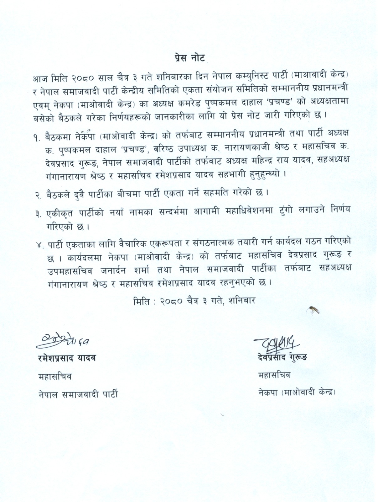 नेसपाका महासचिव रमेशप्रसाद यादव र माओवादीका महासचिव देवप्रसाद गुरुङले बैठकपछि संयुक्त रूपमा जारी गरेको प्रेस विज्ञप्तिअनुसार एकीकृत पार्टीको नयाँ नाम आगामी महाधिवेशनले टुंगो लगाउने निर्णय भएको छ।
