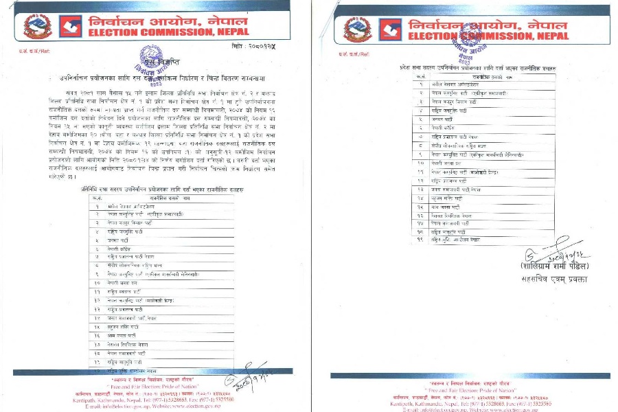 निर्वाचन आयोगले उपनिर्वाचनका लागि दर्ता भएका दललाई निर्वाचन चिह्नको क्रम निर्धारण पनि गरेको छ। आयोगका प्रवक्ता शालिग्राम शर्मा पौडेलले सोमबार विज्ञप्ति जारी गर्दै राजनीतिक दलसम्बन्धी नियमावलीबमोजिम निर्वाचन प्रयोजनका लागि दर्ता गरिएको जनाएका छन्। यसरी दर्ता भएका राजनीतिक दलहरूलाई निर्वाचन चिह्न प्रदान गरी निर्वाचन चिह्नको क्रम निर्धारणसमेत गरिएको उनले उल्लेख गरेका छन्।