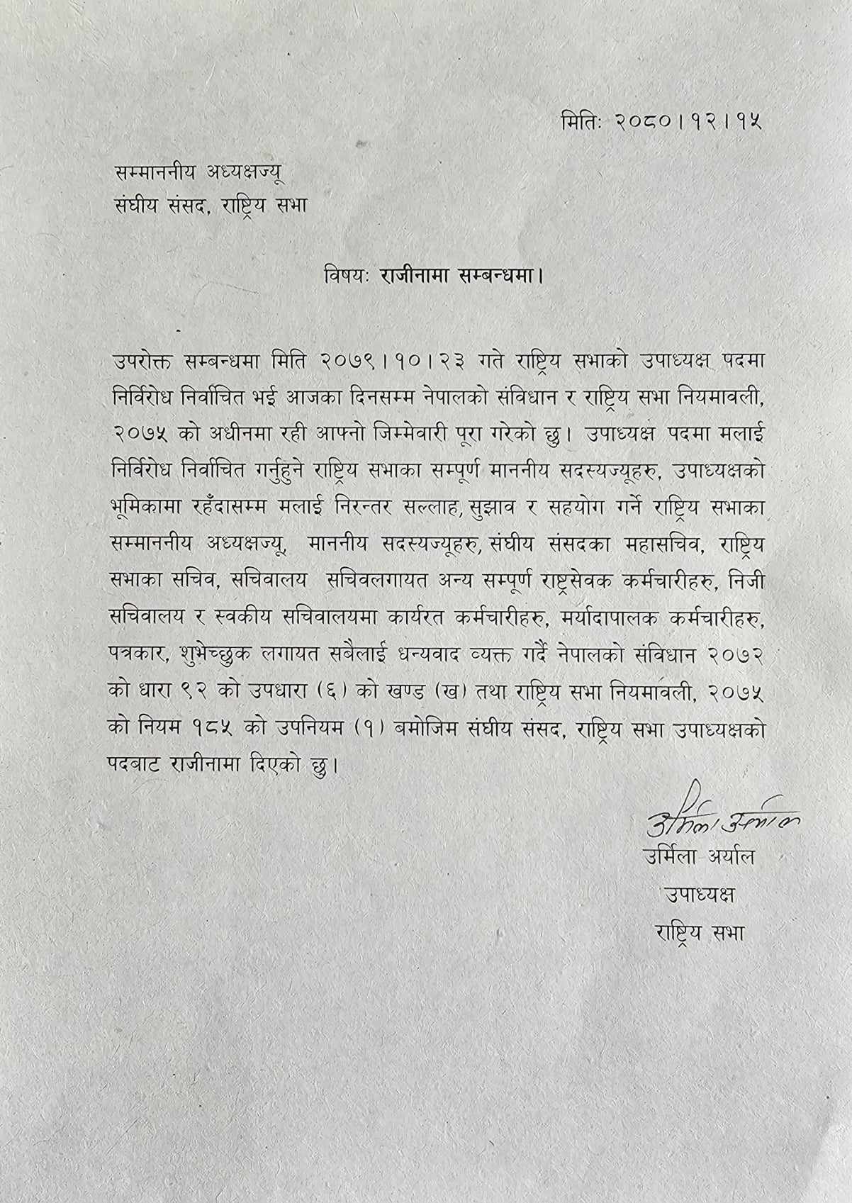 राष्ट्रियसभा उपाध्यक्ष पदबाट उर्मिला अर्यालले राजीनामा दिएकी छन्।