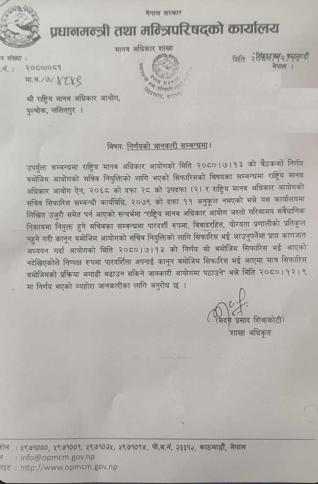 मन्त्रिपरिषद्को कार्यालयले मानव अधिकार आयोगलाई पत्र पठाएर कानूनबमोजिम भएर आएमा मात्र सचिव नियुक्तिको सिफारिस अगाडि बढाउने जानकारी दिएको छ।