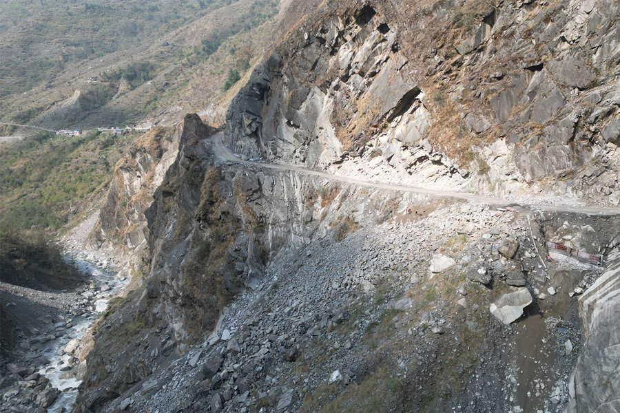 मजदुरहरूले डोरीमा झुन्डिएर ड्रिलिङ गरेर पहाडमा पर्खालको बेस बनाएका छन्। १०० मिटर लम्बाइको दूरीमा ड्रिलिङ गरेर फलामको रड राख्ने प्वाल बनाइएको छ। थप ५० मिटरमा ड्रिलिङ गर्न बाँकी छ। रक एङ्करिङ गर्नुपर्ने ठाउँको ३.५ मिटर फराकिलो सडकमा हाल एकतर्फी सवारीसाधन चल्ने गरेका छन्। यसलाई दुईतर्फी बनाउन सातदेखि आठ मिटर फराकिलो बनाउन लागिएको हो।