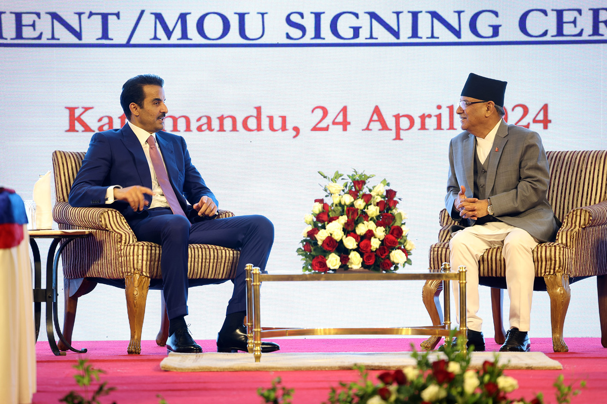 काठमाडौँ– प्रधानमन्त्री पुष्पकमल दाहाल ‘प्रचण्ड’ र कतारका अमिर शेख तमिम बिन हमाद अल थानीबीच भेटवार्ता भएको छ।