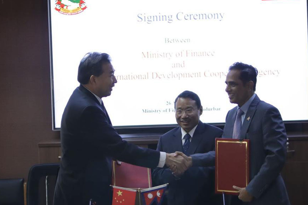 अर्थसचिव मधुकुमार मरासिनी र स्वास्थ्यसचिव डा. रोशन पोखरेल तथा चिनियाँ अन्तर्राष्ट्रिय विकास सहयोग संस्थाका प्रमुख लियु झाओ हुईले सम्झौतामा हस्ताक्षर गरे।
