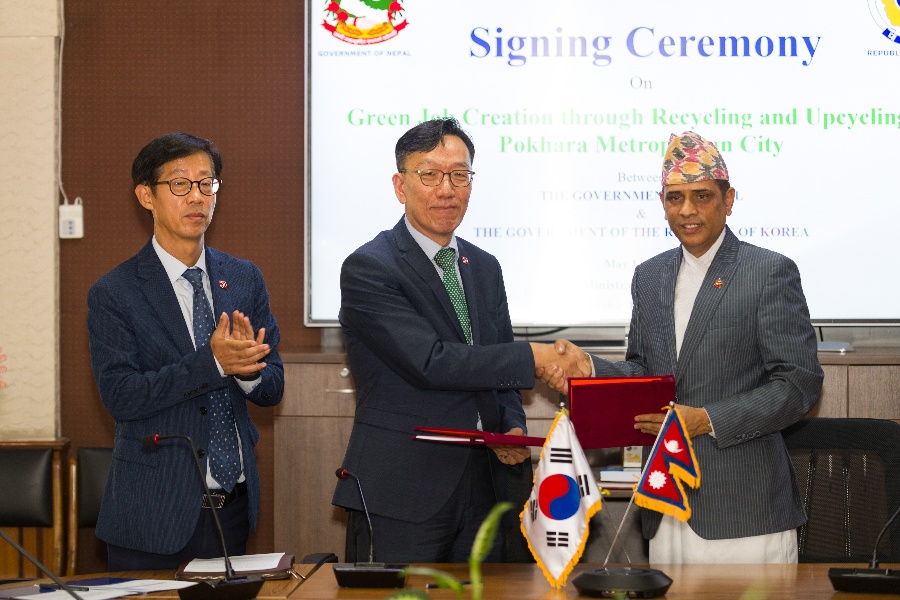 पोखरा महानगरपालिकामा सञ्चालन हुने ‘रिसाइक्लिङ एन्ड क्रियट ग्रीन जब’ परियोजनाका लागि दुई पक्षबीच समझदारी पत्र (एमओयू)मा हस्ताक्षर भएको छ। नेपालका लागि गणतन्त्र कोरियाका राजदूत ताइयोङ पार्क र परराष्ट्र मन्त्रालयका सचिव मधुकुमार मरासिनीले उक्त समझदारी पत्रमा मंगलबार हस्ताक्षर गरेका हुन्।