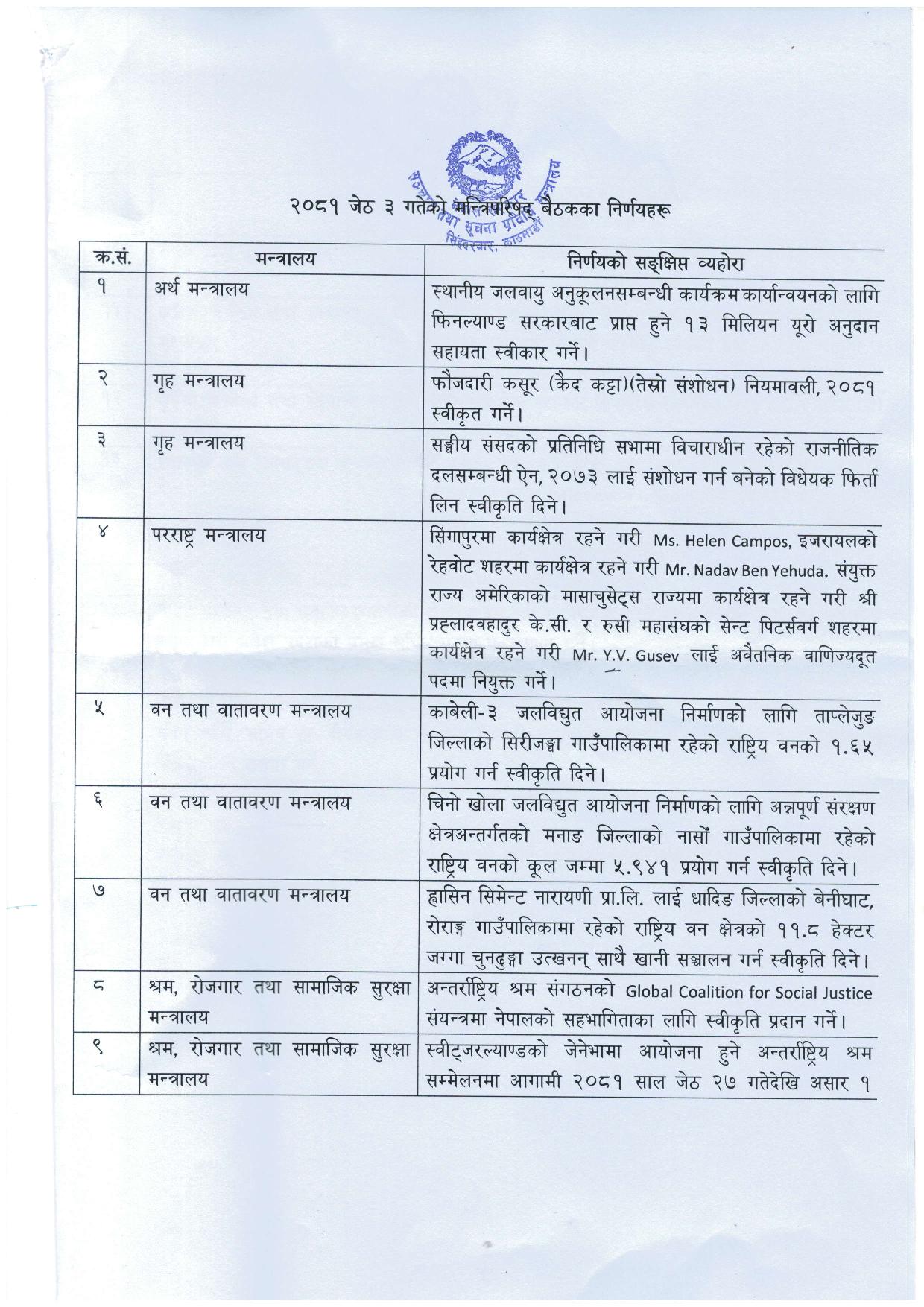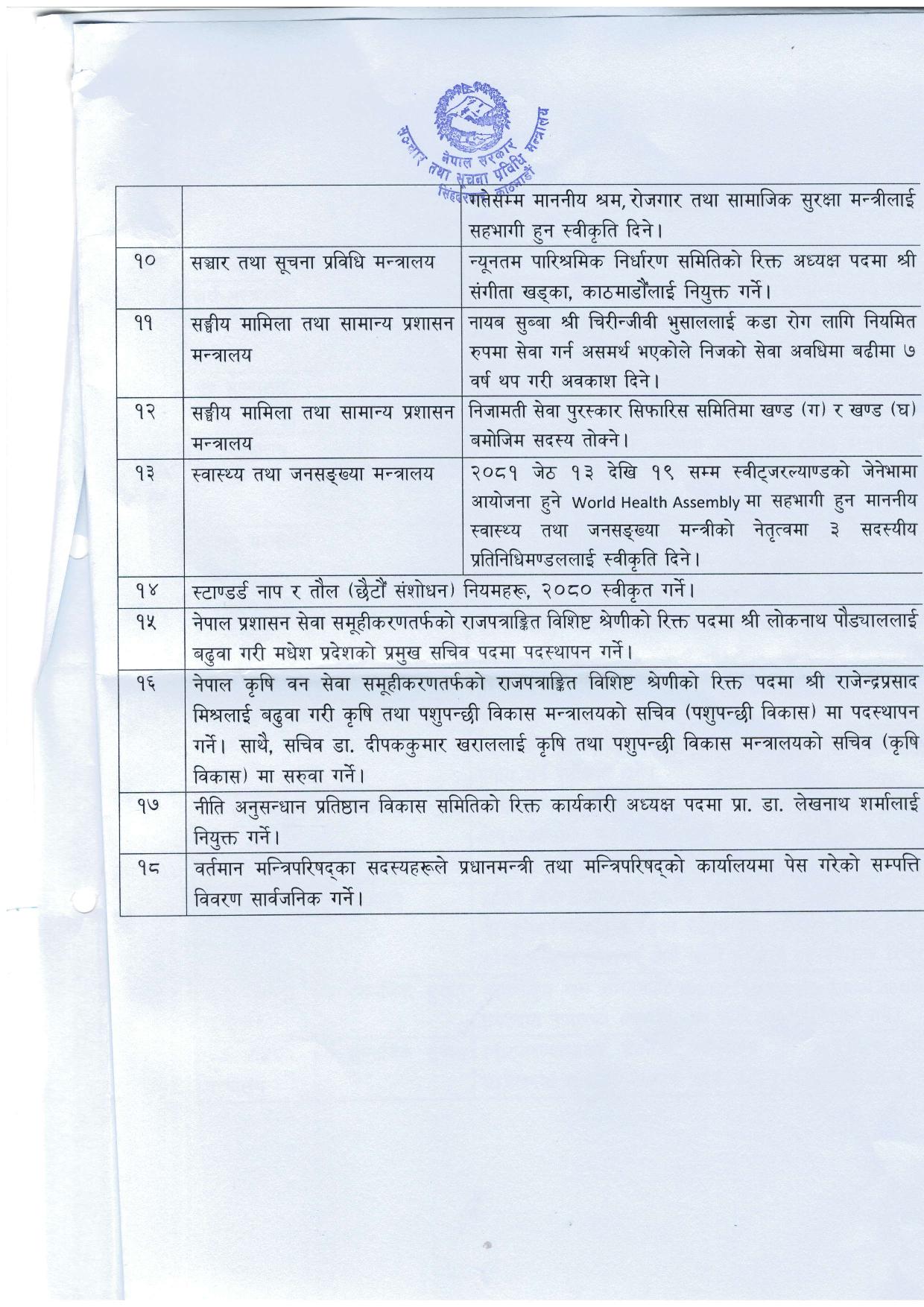 सोही बैठकले नीति अनुसन्धान प्रतिष्ठान विकास समितिको कार्यकारी अध्यक्ष पदमा प्रा लेखनाथ शर्मा र न्यूनतम पारिश्रमिक निर्धारण समितिको अध्यक्ष पदमा सङ्गीता खड्का (काठमाडौँ) लाई नियुक्त गर्ने र नेपाल प्रशासन सेवा सामूहिकीकरणतर्फको राजपत्राङ्कित विशिष्ट श्रेणीको पदमा लोकनाथ पौडेल तथा नेपाल कृषि वन सेवा सामूहिकीकरणतर्फको राजपत्राङ्कित विशिष्ट श्रेणीको पदमा राजेन्द्रप्रसाद मिश्रलाई बढुवा गर्ने निर्णय गरेको छ।