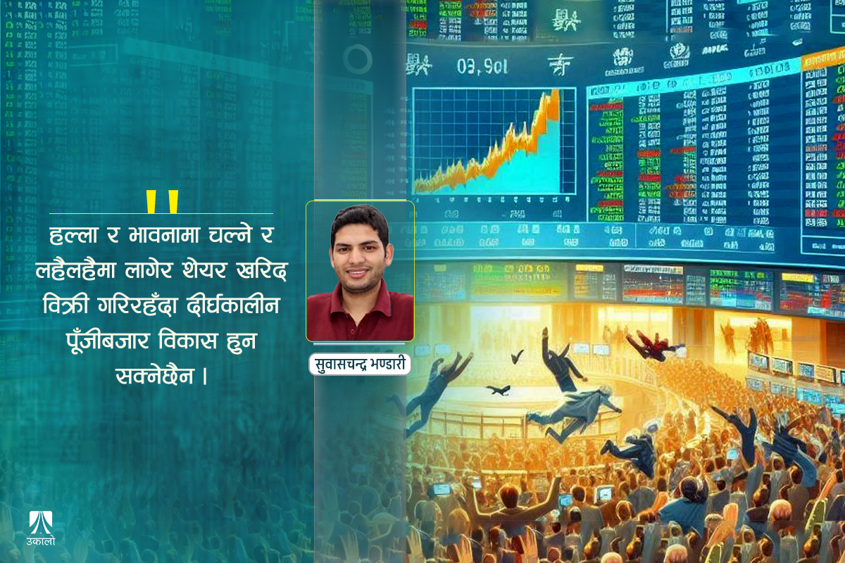 यीलगायत अन्य थुप्रै प्रयास सरकार, सरकारका नियामक निकाय, लगानीकर्ता तथा खरिदबिक्रीमा प्रत्यक्ष संलग्न हुने ब्रोकरहरूले खेल्न सके नेपालको पुँजीबजारलाई जुवा खालभन्दा पनि स्थायी स्टक मार्केटको रूपमा विकास गरी समग्र अर्थतन्त्रको विकासमा फड्को मार्न सकिन्छ। अझै पनि हल्ला र भावनामा चल्ने र अरूकै लहैलहैमा लागेर शेयर खरिद विक्री गरिरहने हो भने क्षणिक समयमा केही नाफा कमाउन सकिएला, तर त्यसले दीर्घकालीन पुँजीबजार विकास हुन सक्दैन।