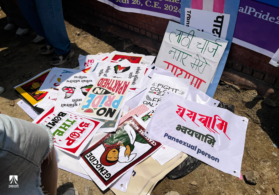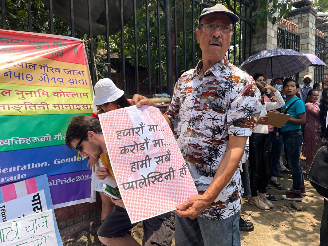 ‘प्यालेस्टाइन माथिको युद्ध रोक’, ‘स्टप बम’, ‘नो पिंकवासिङ जिनोसाइड’ लगायतका पम्प्लेट, प्लेकार्ड पनि परेडमा देखिए।