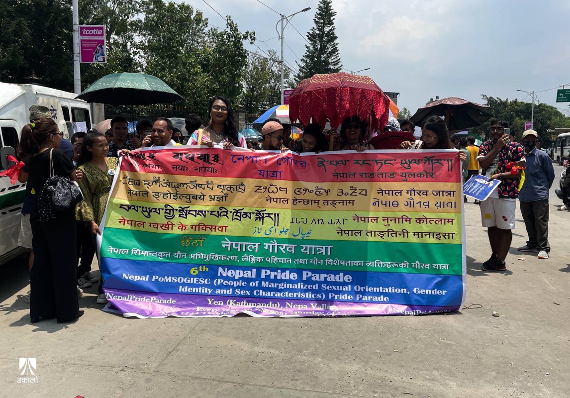 शनिबार मध्याह्न। टेम्पो नम्बर ३८५८ मा बजिरहेको थियो, ‘कता–कता छौ कुन रूपमा, कुन सोचमा हराउँदै कुन गीतको कुन बोलमा आफैँलाई पहिल्याउँदै... हतारिँदै बतासिँदै’ बोलको गीत। इन्द्रेणी रङका पम्प्लेटमा लेखिएका थिए ‘गौरव’, ‘लभ इज नेभर रन्ग’ लगायतका नारा। युवाहरू गायक साजनराज वैधको सो गीतमा मोहित देखिन्थे। यो दृश्य हो ‘छैटौँ क्वेयर प्राइड मार्च’का क्रममा रत्नपार्क शान्तिवाटिकाबाट जमलतर्फ मोडिँदाको। गीतको भिडियोमा पनि समलिंगी पुरुषको प्रेमबारे देखाइएको छ। शब्द र भावना र परेडको एकाकारले होला गीत र माहौल एकअर्काका परिपूरक बनेका थिए अर्थात् पार्श्वमा बजिरहेको गीतको आशय मार्च गरिरहेको भीडसँग मिल्दो थियो।