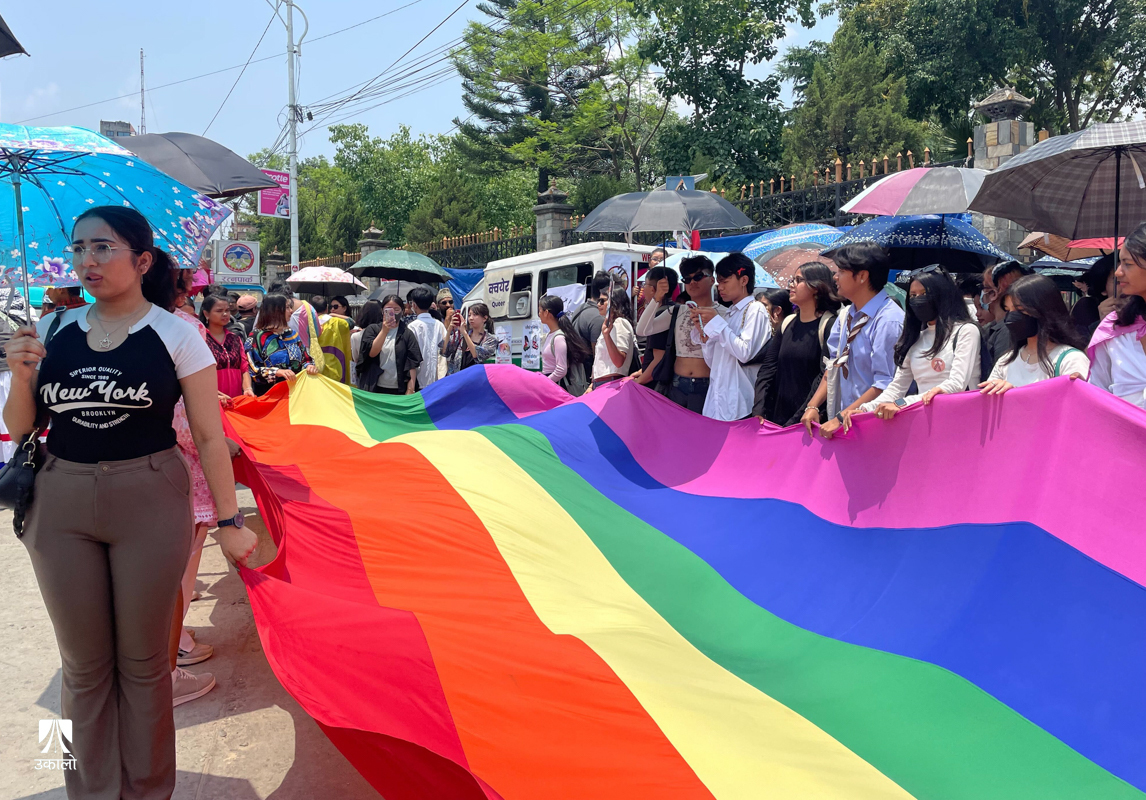 शनिबार मध्याह्न। टेम्पो नम्बर ३८५८ मा बजिरहेको थियो, ‘कता–कता छौ कुन रूपमा, कुन सोचमा हराउँदै कुन गीतको कुन बोलमा आफैँलाई पहिल्याउँदै... हतारिँदै बतासिँदै’ बोलको गीत। इन्द्रेणी रङका पम्प्लेटमा लेखिएका थिए ‘गौरव’, ‘लभ इज नेभर रन्ग’ लगायतका नारा। युवाहरू गायक साजनराज वैधको सो गीतमा मोहित देखिन्थे। यो दृश्य हो ‘छैटौँ क्वेयर प्राइड मार्च’का क्रममा रत्नपार्क शान्तिवाटिकाबाट जमलतर्फ मोडिँदाको। गीतको भिडियोमा पनि समलिंगी पुरुषको प्रेमबारे देखाइएको छ। शब्द र भावना र परेडको एकाकारले होला गीत र माहौल एकअर्काका परिपूरक बनेका थिए अर्थात् पार्श्वमा बजिरहेको गीतको आशय मार्च गरिरहेको भीडसँग मिल्दो थियो।