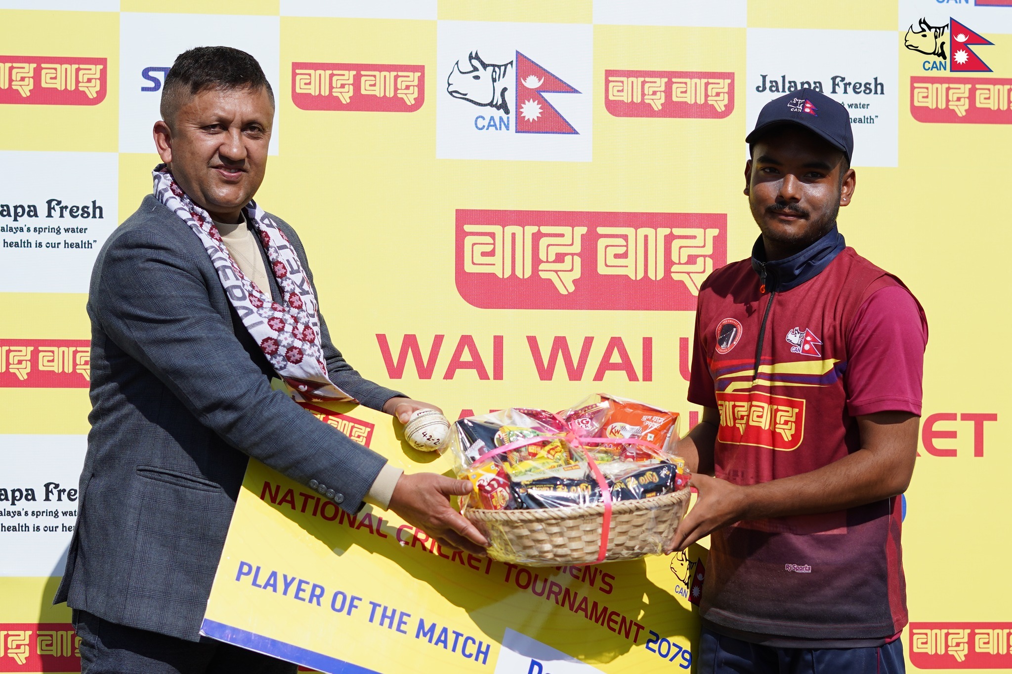 ओपनर आकाश त्रिपाठीले १७ रन बनाउँदा प्रज्ज्वल थापा १५ रनमा आउट भए। उनीहरूले पहिलो विकेटका लागि ४० रनको साझेदारी गरेका छन्। यता, सुनिल भण्डारी ६ र विशाल भुसाल ८ रनमा अविजित रहे।