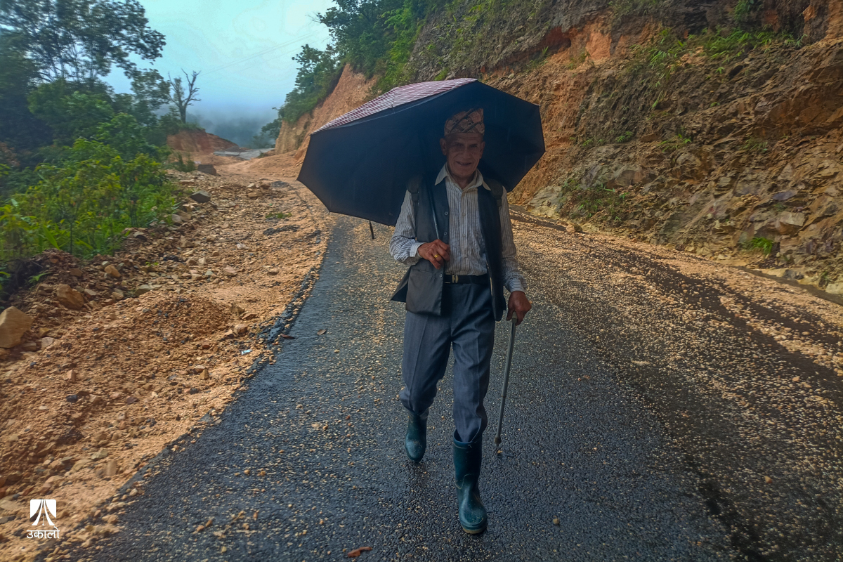 पोखरा– पोखरा महानगरपालिका–२३ माथिल्लो सिधानेका लालबहादुर भुजेल (७३) असारे झरीमा छाता ओढेर ओरालो झर्दै गरेका भेटिए। उनलाई बिहान ९ बजेको गाडी भेट्न घाँटीछिना पुग्नुपर्ने हतार थियो।