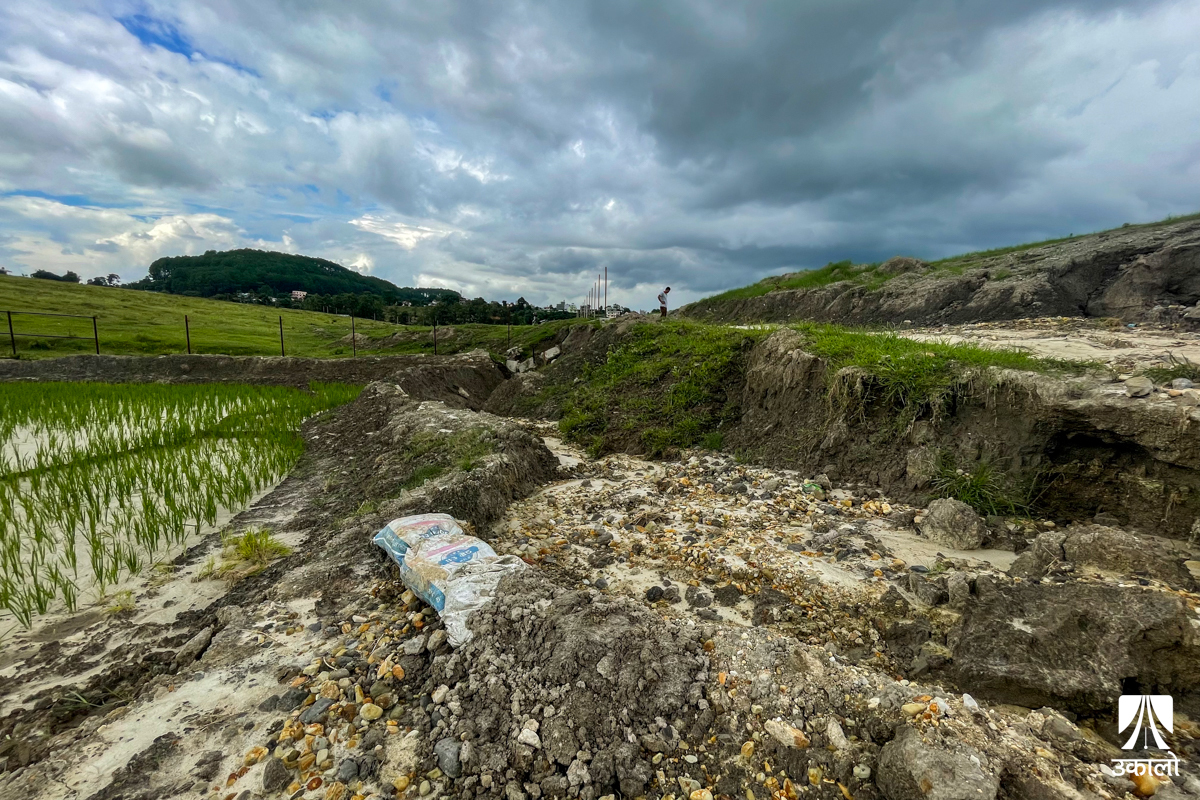 अहिले खेत भास्सिन थालेको र प्लटिङकै कारण यस्तो भएको उनी बताउँछन्। “पहिले कुलोको छेउबाट पानी जाने गर्थ्यो। कुलो माथिबाट थुनेपछि प्लटिङकै कारण समस्या आएको छ,” उनी भन्छन्, “ठूलो खोला थिएन तर सिजनको समयमा बग्ने खोला हो।”
