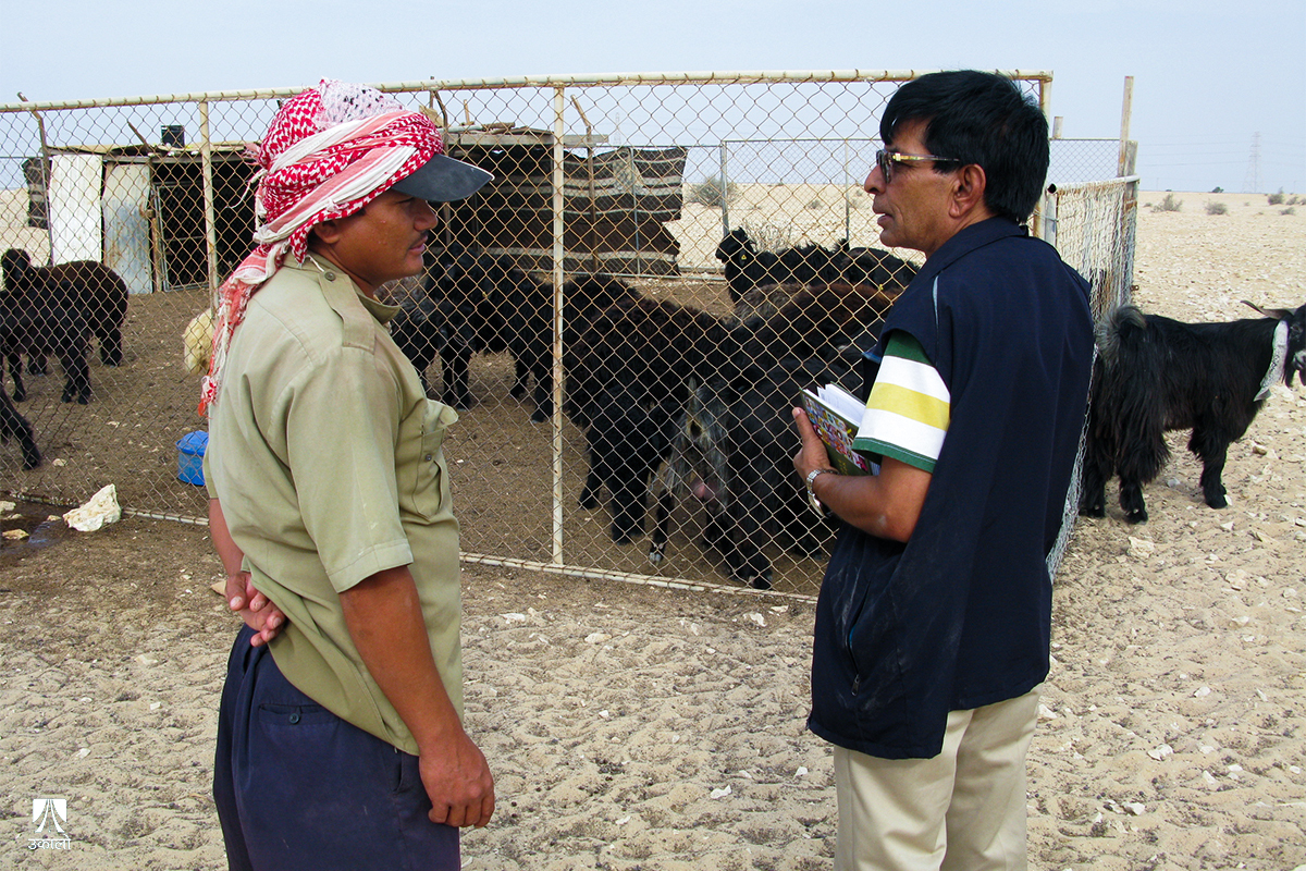 के थाहा? शुक्रबारे छुट्टीमा पनि छड्के गर्न अरबी मालिक आइहाल्छ कि? ‘ताल ताल’ भन्दै बाख्रा वा मान्छेलाई एकै लयमा बोलाउने कफिल वा मुदिर अलिक नरम मिजासको पर्यो भने बढीमा एक/दुई दाना खजुर र एक बोत्तल पानी दिन्थ्यो। कडा मिजासको पर्यो भने कुटौँला झैं गर्दै बाख्रे टहरोबाट खेदाइहाल्थ्यो, चाहे आएको पाहुना जोसुकै होस्।