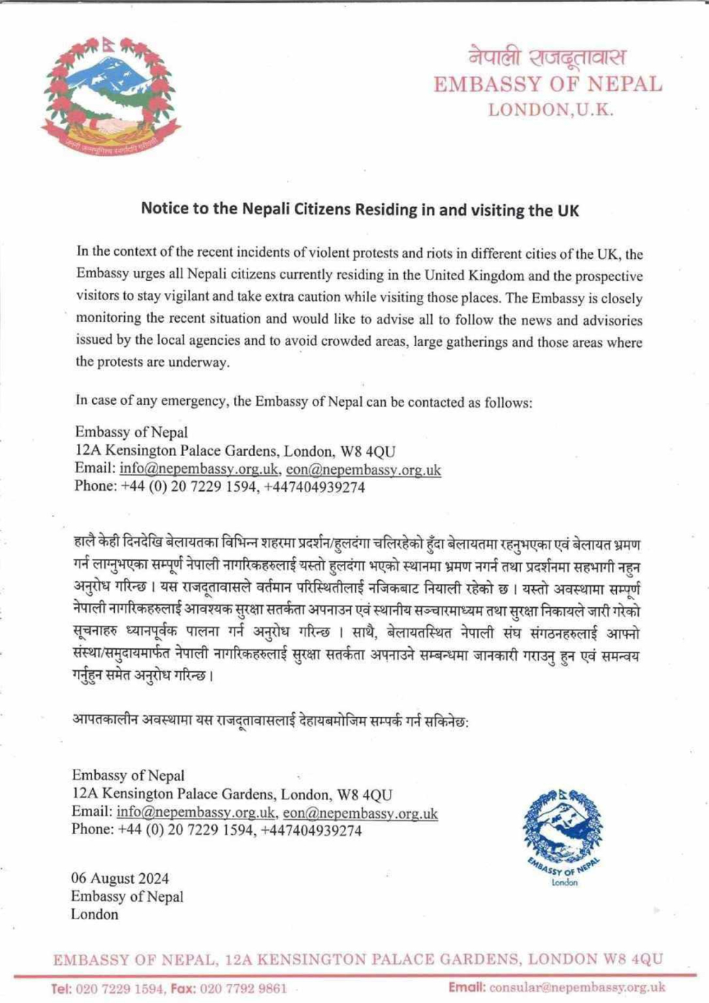 लन्डनस्थित नेपाली राजदूतावासले बेलायतमा रहेका नेपाली नागरिकलाई हुलदंगा भएको स्थानमा नजान र प्रदर्शनमा सहभागी नहुन अनुरोध गरेकोछ।