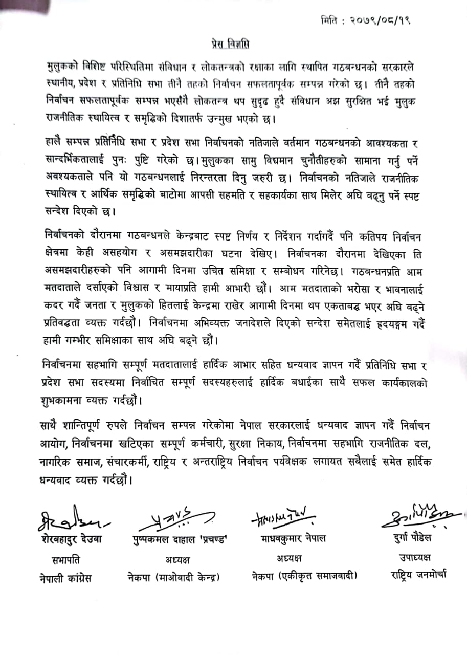 कांग्रेस सभापति देउवा, माओवादी केन्द्रका अध्यक्ष दाहाल, नेकपा एकीकृत समाजवादीका अध्यक्ष नेपाल र राष्ट्रिय जनमोर्चाका उपाध्यक्ष दुर्गा पौडेलले संयुक्त रूपमा जारी विज्ञप्तिमा भनिएको छ, "मुलुकका सामु विद्यमान चुनौतीहरूको सामना गर्नुपर्ने आवश्यकताले पनि यो गठबन्धनलाई निरन्तरता दिनु जरुरी छ। निर्वाचनको नतिजाले राजनीतिक स्थायित्व र आर्थिक समृद्धिको बाटोमा आपसी सहमति र सहकार्यका साथै मिलेर अघि बढ्नुपर्ने स्पष्ट सन्देश दिएको छ।"