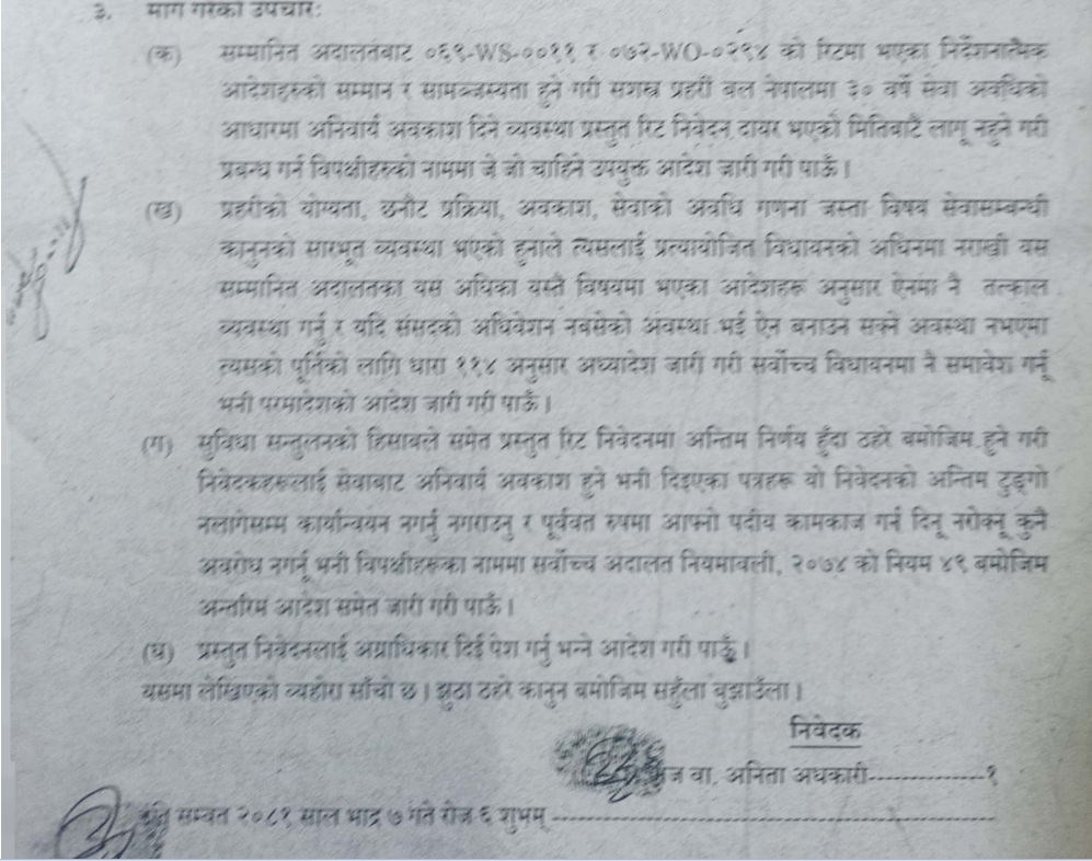 “प्रहरीको योग्यता, छनोट प्रक्रिया, अवकाश, सेवाको अवधिको गणना जस्ता विषय सेवासम्बन्धी कानूनको सारभूत व्यवस्था भएको हुनाले त्यसलाई प्रत्यायोजित विधायनको अधीनमा नराखी यस सम्मानित अदालतबाट यसअघिका यस्तै विषयमा भएका आदेशहरू अनुसार ऐनमा नै तत्काल व्यवस्था गर्नु र यदि संसद्को अधिवेशन नबसेको अवस्था भई ऐन बनाउन सक्ने अवस्था नभएमा त्यसको पूर्तिका लागि धारा ११४ अनुसार अध्यादेश जारी गरी सर्वोच्च विधायनमा नै समावेश गर्नू भनी परमादेशको आदेश जारी गरी पाऊँ,” रिट निवेदनमा भनिएको छ।