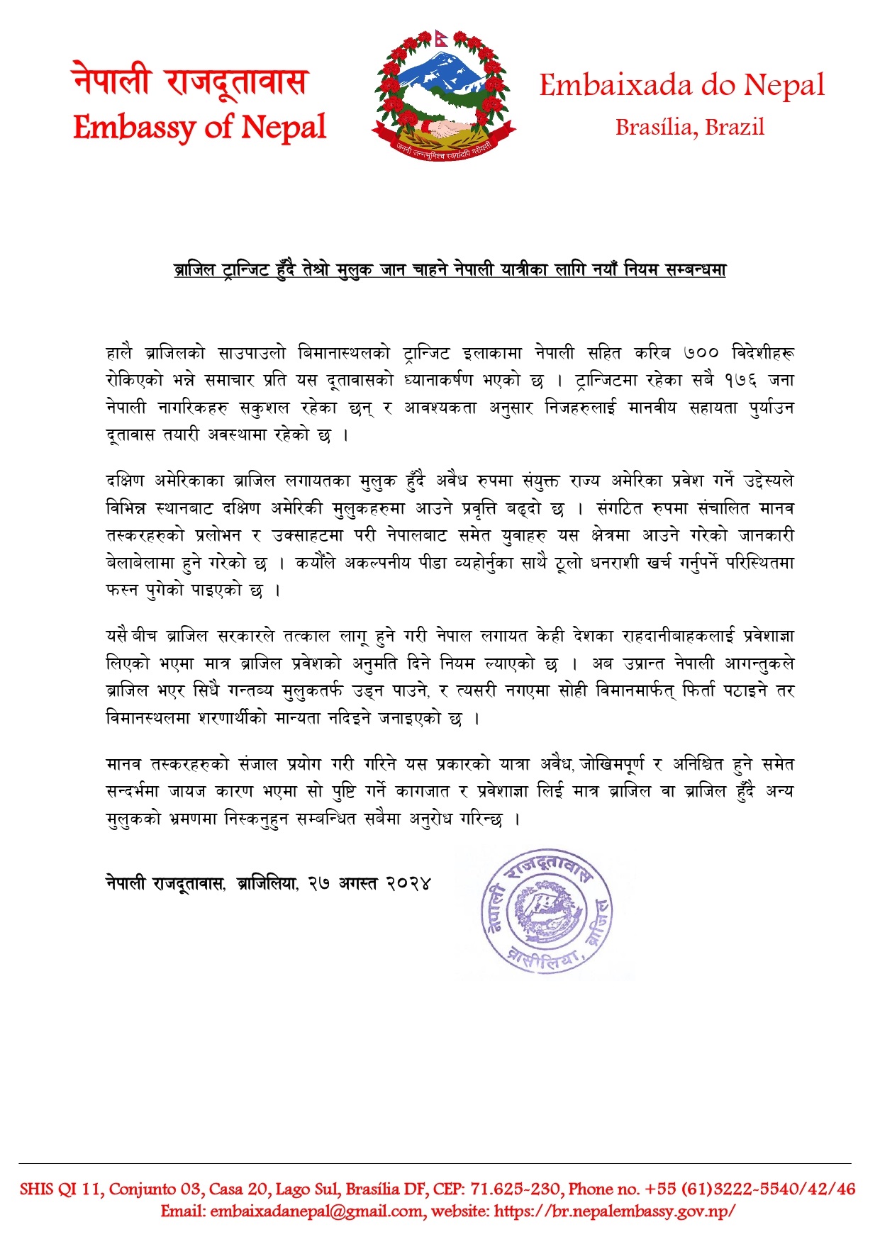 यसैबीच ब्राजिल सरकारले तत्काल लागू हुने गरी नेपाललगायत केही देशका राहदानीबाहकलाई प्रवेशाज्ञा लिएको भएमा मात्र ब्राजिल प्रवेशको अनुमति दिने नियम ल्याएको छ। अब उप्रान्त नेपाली आगन्तुकले ब्राजिल भएर सिधै गन्तव्य मुलुकतर्फ उड्न पाउने, र त्यसरी नगएमा सोही विमानमार्फत् फिर्ता पठाइने तर विमानस्थलमा शरणार्थीको मान्यता नदिइने जनाइएको दूतावासले विज्ञप्तिमार्फत जानकारी गराएको छ।