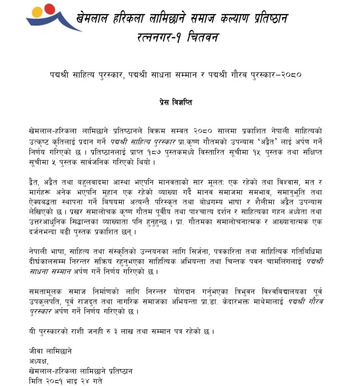 खेमलाल–हरिकला प्रतिष्ठानले २०८० सालको पद्मश्री साहित्य पुरस्कार प्रा. कृष्ण गौतमको उपन्यास ‘अद्वैत’लाई दिने निर्णय गरेको छ।