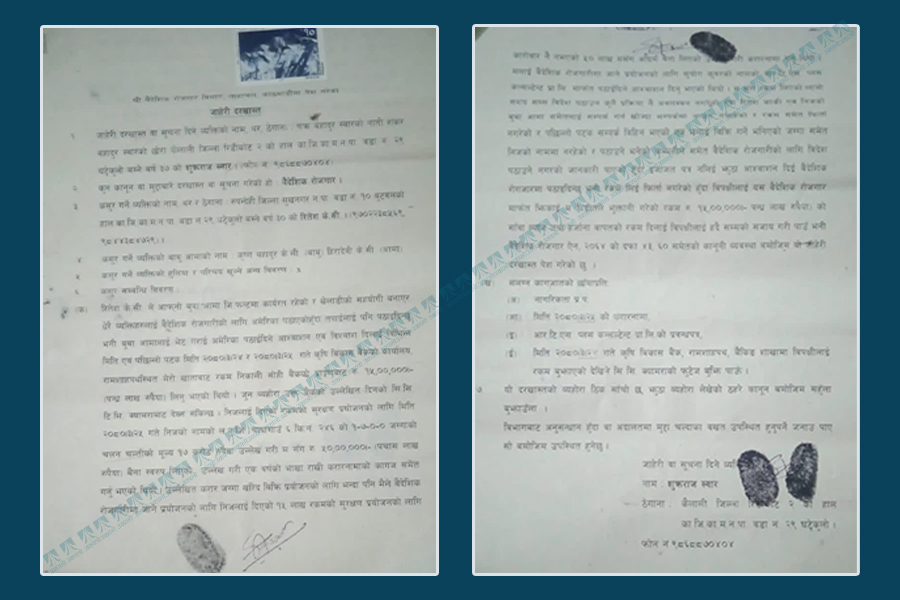 खेलाडीहरूको सहयोगी बनाएर अमेरिका पठाइदिने भन्दै कैलालीका शुक्रराज स्वारसँग ७ लाख रुपैयाँ लिएर रितेश केसीले ‘जग्गा किन्न ५० लाख बैना लिएको’ कागज बनाइदिए। अहिले त्यही कागज बोकेर स्वार भौँतारिइरहेका छन्।