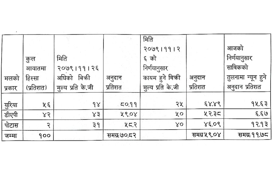 हालसम्म सरकारले युरिया मलमा ८०.११ प्रतिशत, डीएपीमा ५९.०४, र पोटासमा ५८.२ प्रतिशतका दरले अनुदान दिँदै आएको थियो। कृषि मन्त्रालयले युरिया मलमा १५.६३ प्रतिशत, डीएपीमा ६.६७ र पोटासमा १२.१३ प्रतिशत अनुदान कटौती गरेको हो।