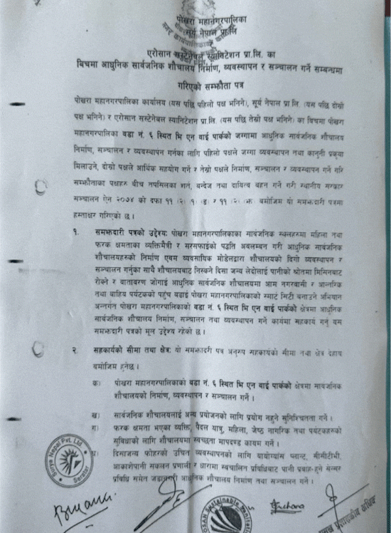 पोखरा–६, बाराहीघाट छिर्ने चोकैमा छ भीएनवाई पार्क। यही पार्कमा महानगरले सार्वजनिक निजी साझेदारीमा शौचालय बनाउन सम्झौता गरेको हो। महानगर र कम्पनीबीच भएको त्रिपक्षीय सम्झौतामा पोखरा महानगरपालिकाको तर्फबाट प्रमुख प्रशासकीय अधिकृत वीरेन्द्रदेव भारतीले हस्ताक्षर गरेका छन्। भारती अहिले सरुवा भएर ललितपुर महानगर पुगिसके। निर्माण कम्पनीतर्फको दोस्रो पक्ष सूर्य नेपालका व्यवस्थापक बाबुराम कार्की र तेस्रो पक्ष एरोसान सस्टेनेबलका प्रशासकीय अधिकृत लक्ष्मण थापाले सम्झौतापत्रमा हस्ताक्षर गरेका छन्।