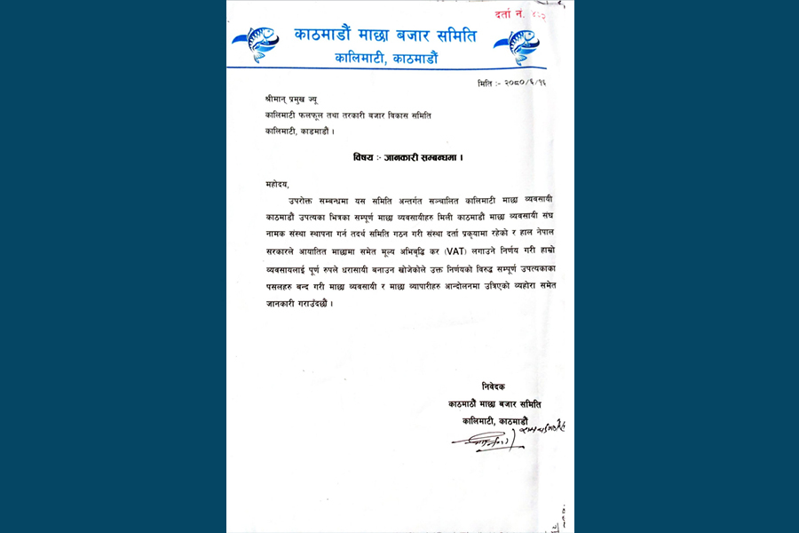 समितिका महासचिव गामीले हस्ताक्षर गरेको पत्रमा लेखिएको छ, “हाल नेपाल सरकारले आयातित माछामा समेत मूल्य अभिवृद्धि कर लगाउने निर्णय गरी हाम्रो व्यवसायलाई पूर्णरूपले धरासायी बनाउन खोजेकोले उक्त निर्णयविरुद्ध सम्पूर्ण उपत्यकाका पसलहरू बन्द गरी माछा व्यवसायी र माछा व्यापारीहरू आन्दोलनमा उत्रिएको व्यहोरा जानकारी गराउँदछौँ।”
