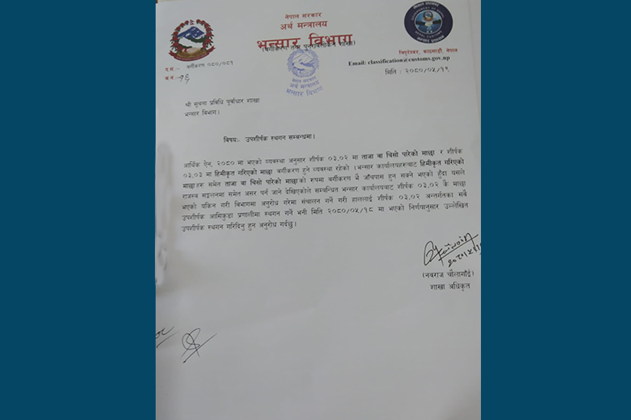 यो व्यवस्थाले हिमीकृत गरिएका माछासमेत भन्सार कार्यालयहरूबाट ताजा वा चिसो पारेको माछाको रूपमा वर्गीकरण भई जाँचपास हुनसक्ने भएको हुँदा राजस्व संकलनमा असर पर्न जाने देखिएको विभागको परिपत्रमा उल्लेख छ। सूचना प्रविधि पूर्वाधार शाखालाई सम्बोधन गरिएको परिपत्रमा भनिएको छ, “सम्बन्धित भन्सार कार्यालयबाट शीर्षक ०३.०२ कै माछा भएको यकिन गरी विभागमा अनुरोध गरेमा संचालन गर्ने गरी हाललाई शीर्षक ०३.०२ अन्तर्गतका सबै उपशीर्षक आसिकुडा प्रणालीमा स्थगन गर्ने।”