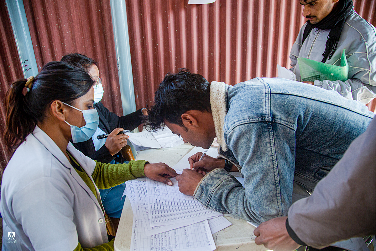 कोही घरमा फोन गर्दै आफ्नो पालो आएर ‘सबै मेडिकल चेक पूरा भयो’ भन्दै खुशीका साथ सुनाउँदै थिए। कोही भने कार्यालयमा ढिला आउने जानकारी गराइरहेका थिए। काठमाडौँबाहिर घर हुनेहरू अस्पतालको परीक्षण सकिनेबित्तिकै घर फर्किनुपर्छ भन्दै एकअर्कासँग कुरा गरिरहेका थिए। बायोमेट्रिकका लागि आएकाहरू हातमा कागजपत्र बोकेर धैर्यपूर्वक पालो कुरिरहेका देखिन्थे।