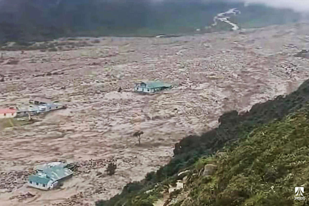 काठमाडौँ– सोलुखुम्बुको खुम्बु पासाङल्हामु गाउँपालिका–५ स्थित थामेखोलामा शुक्रबार दिउँसो एक्कासि ठूलो बाढी आयो। बाढीले थामेगाउँका १३ घर बगायो, १० वटा घरमा आंशिक क्षति पुर्यायो। एक/एक विद्यालय भवन र स्वास्थ्य क्लिनिक तथा दुई होटल पनि बाढीले बगाएर लग्यो। खुम्बु बिजुली कम्पनीको ड्याम क्षतिग्रस्त हुँदा विद्युत् उत्पादन बन्द छ। बाढीले दूधकोशी नदीको तल्लो तटीय क्षेत्रका बस्तीसमेत जोखिममा छन्।