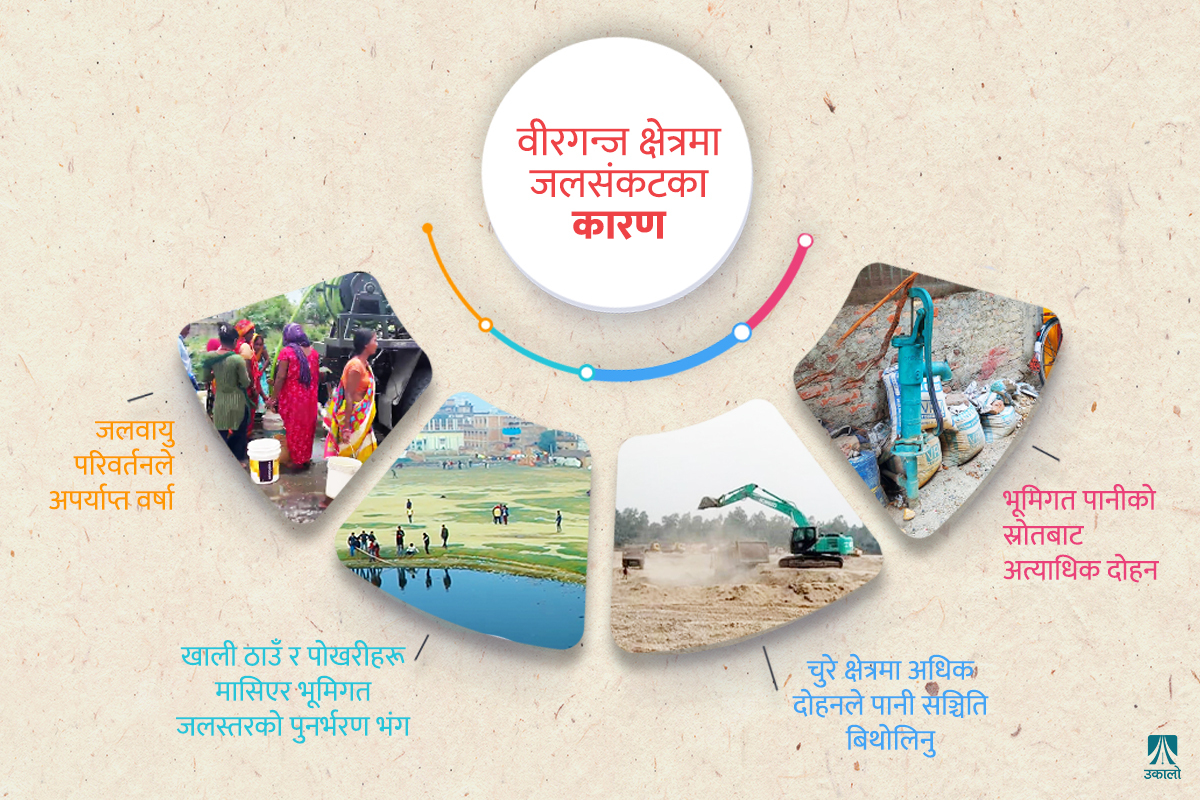 २०७८ सालको जनगणनाअनुसार करिब दुई लाख ७२ हजार जनसंख्या रहेको वीरगन्ज महानगरमा घरपरिसरभित्रै चापाकल राखी मोटर लगाएर पानी तान्ने चलन छ। अहिले सुक्खायाममा चापाकलबाट पानी आउनै छाडेको महानगरका इन्जिनयरहरू बताउँछन्।