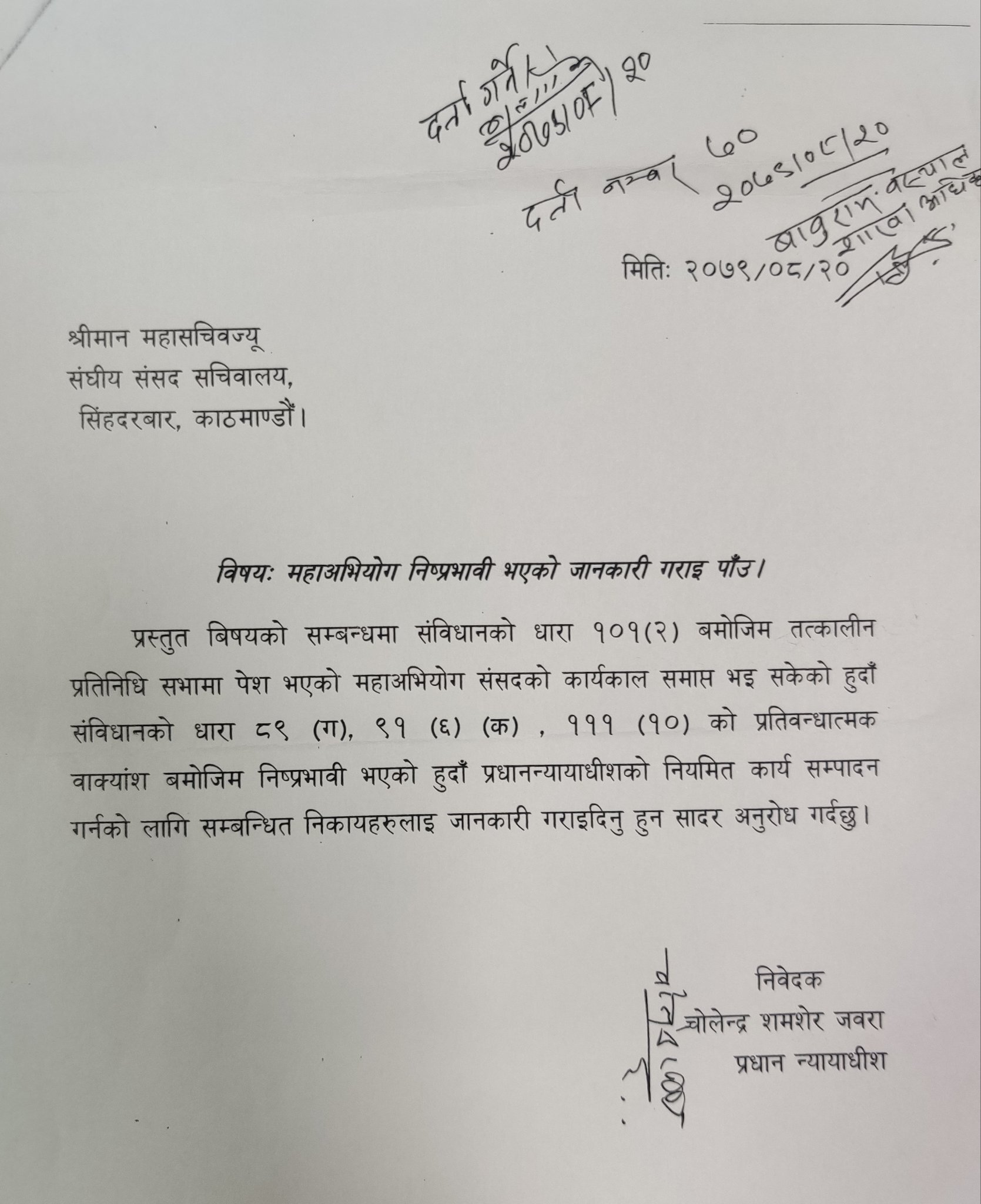 प्रधानन्यायाधीश चोलेन्द्र शमशेर जबराविरुद्धको महाभियोग निष्क्रिय भएको छ। संसद् सचिवालयले जबरालाई महाभियोग प्रस्ताव निष्क्रिय भएको पत्र दिएको हो। योसँगै उनले आजैदेखि सर्वोच्च फर्किने तयारी गरेका छन्।