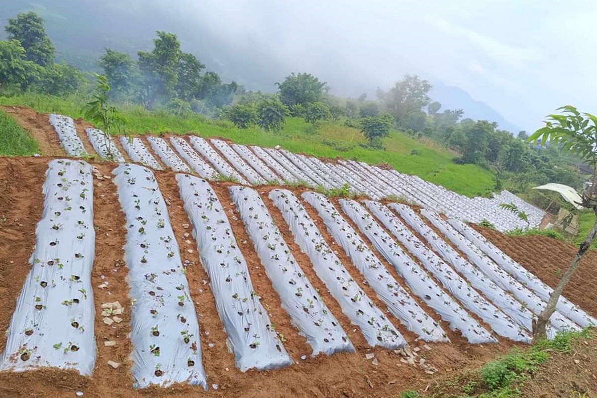 ऋषिङ गाउँपालिकाको लगानीमा डेढ रोपनी जग्गामा दुई हजार २५० स्ट्रबेरीका बिरुवा रोपिएका छन्। परीक्षणका रूपमा खेती गरिएको हो।