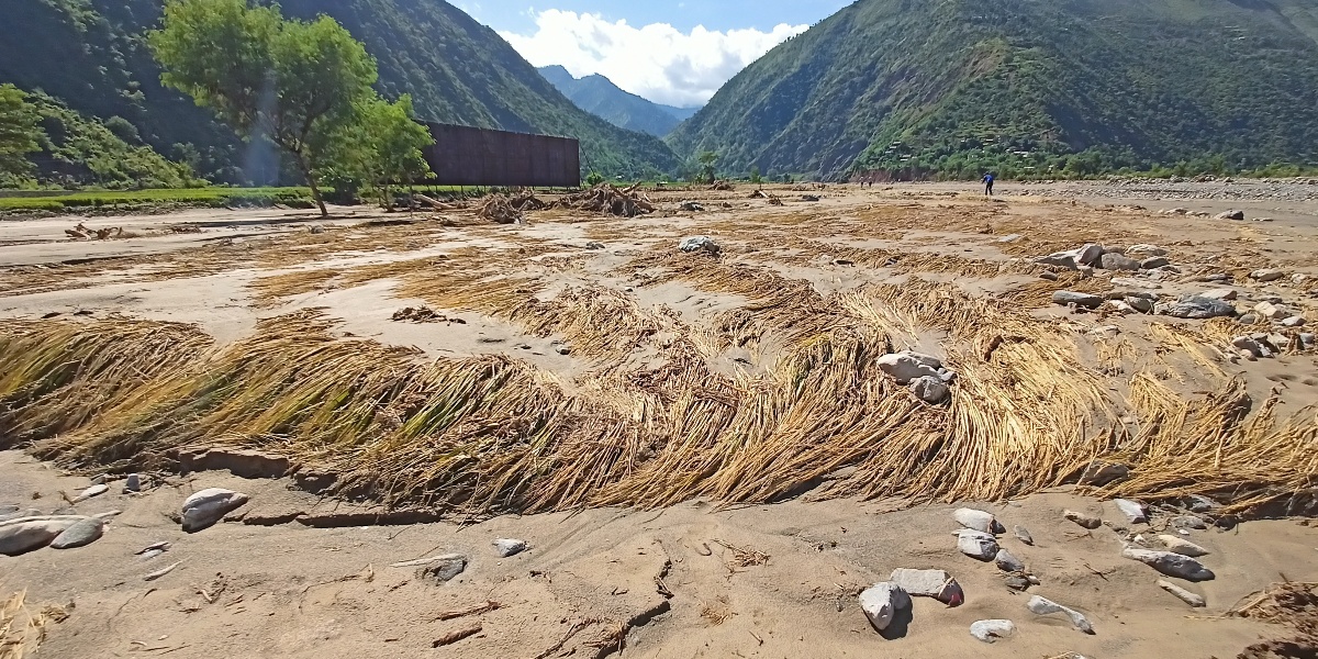 शुक्रबार र शनिबार रोशी खोलामा आएको बाढी धान फाँटमा पस्यो। बाढीसँगै आएको लेदो माटो, गेग्रानले खेत बगर बनाइदियो। धानबाली सखाप भयो।