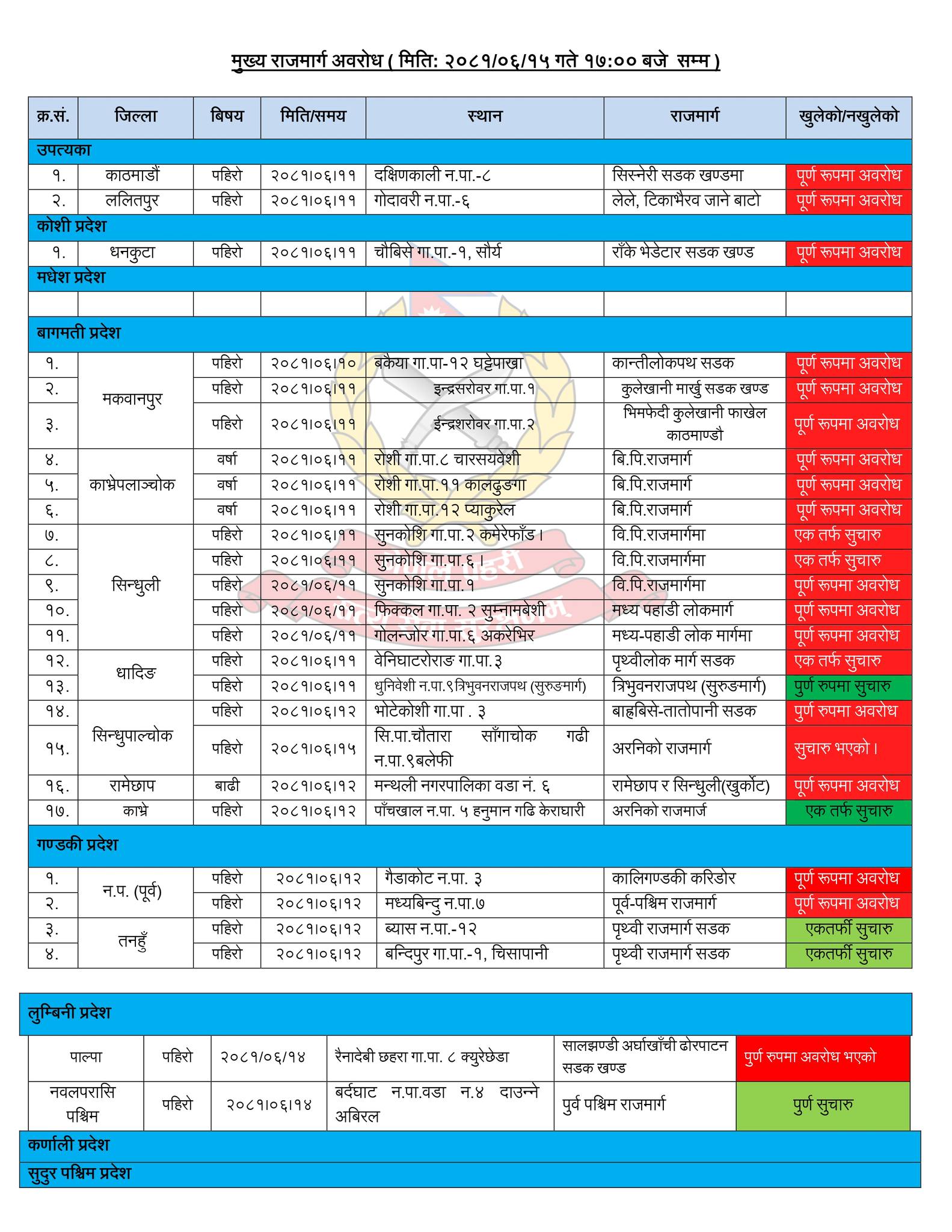 प्रहरीले मंगलबार साँझ सार्वजनिक गरेको सूचनाअनुसार दक्षिणकाली–सिस्नेरी, ललितपुरको लेले–टीकाभैरव, धनकुटाको राँके भेडेटार सडकखण्ड पूर्ण अवरुद्ध छ। यस्तै, बागमती प्रदेशका कान्ति लोकपथ, कुलेखानी–मार्खु, भीमफेदी–कुलेखानी–फाखेल, बीपी राजमार्गका विभिन्न क्षेत्रका सडकखण्ड अवरुद्ध छन्।