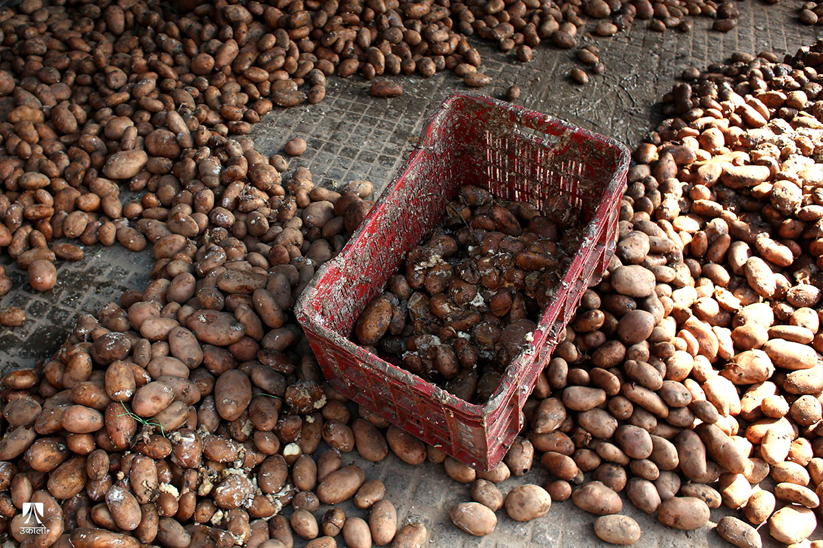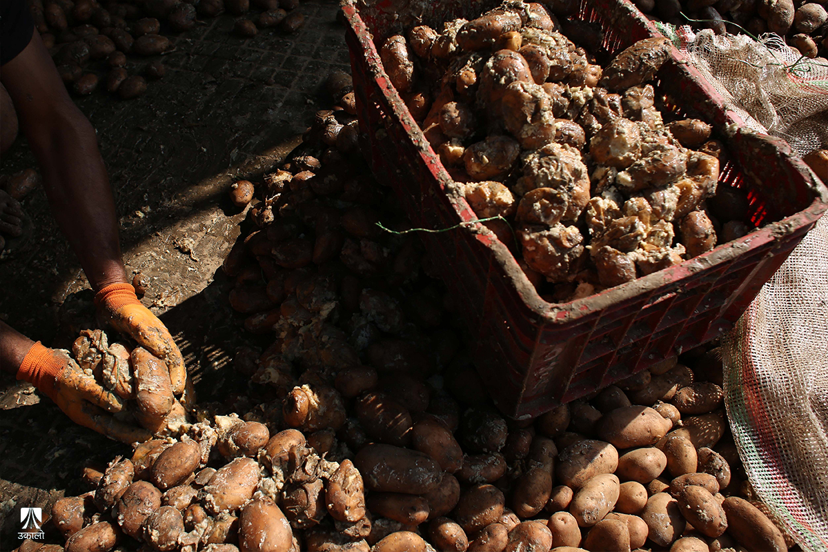 यतिबेला काठमाडाैँको कालिमाटी फलफूल तथा तरकारी बजारमा व्यापारीहरू बोराबाट कुहिएको आलु हटाएर सद्दे आलु घाममा सुकाउनमा व्यस्त छन्।