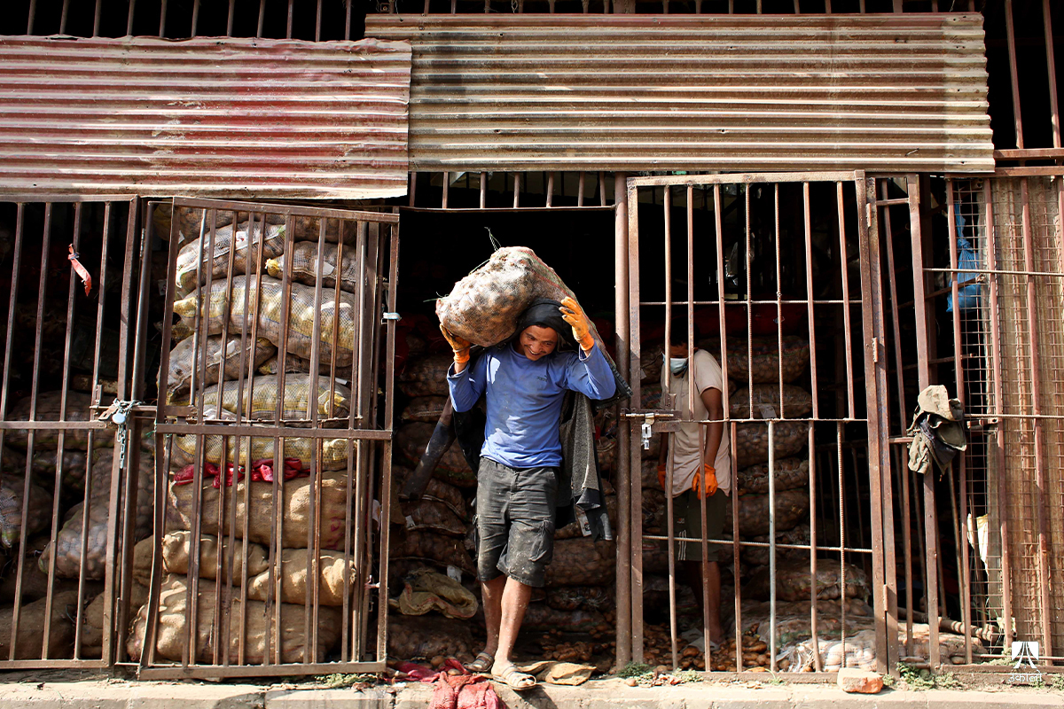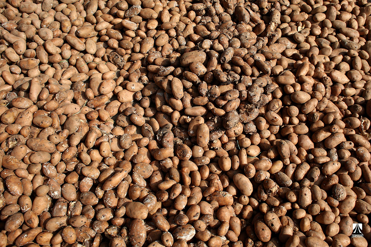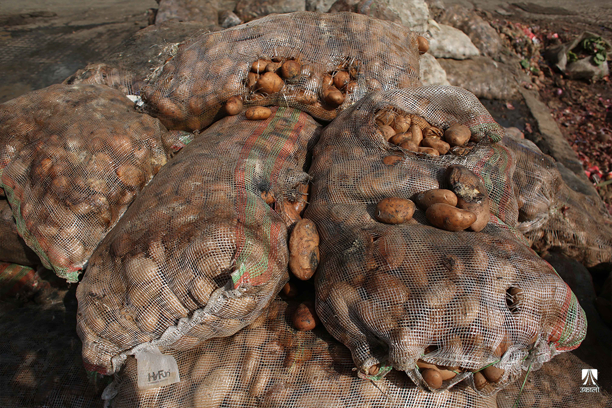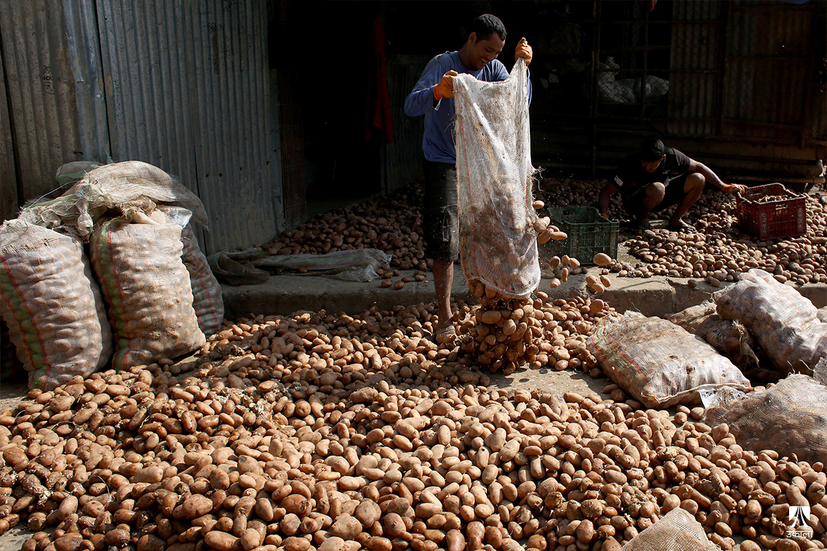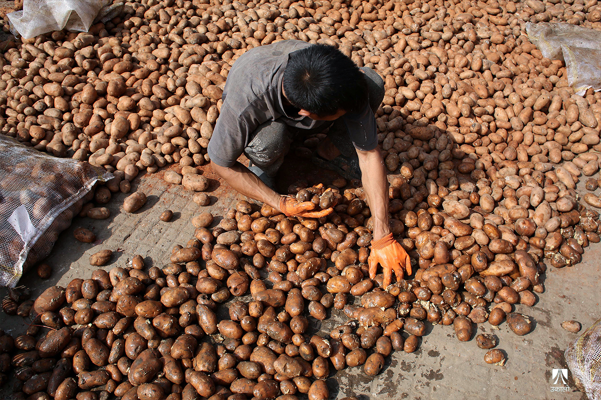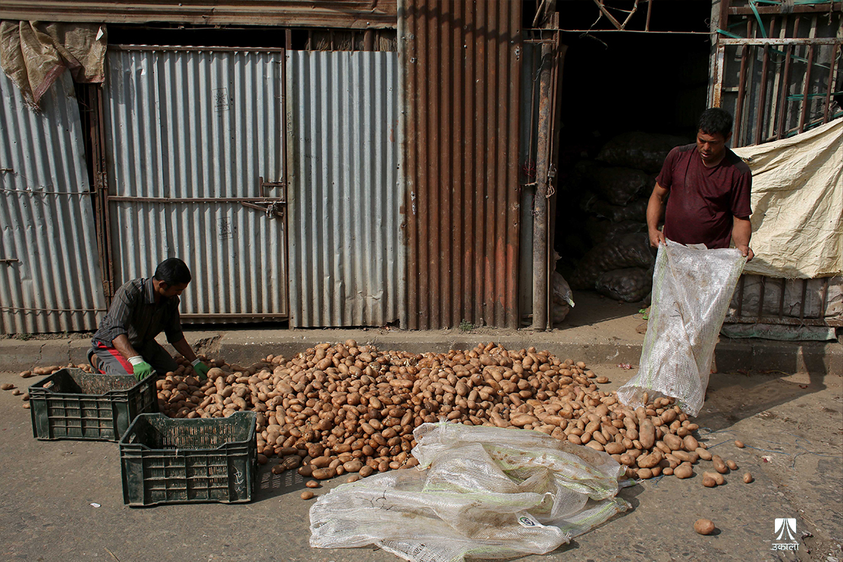 काठमाडाैँ– यतिबेला काठमाडाैँको कालिमाटी फलफूल तथा तरकारी बजारमा व्यापारीहरू बोराबाट कुहिएको आलु हटाएर सद्दे आलु घाममा सुकाउनमा व्यस्त छन्।