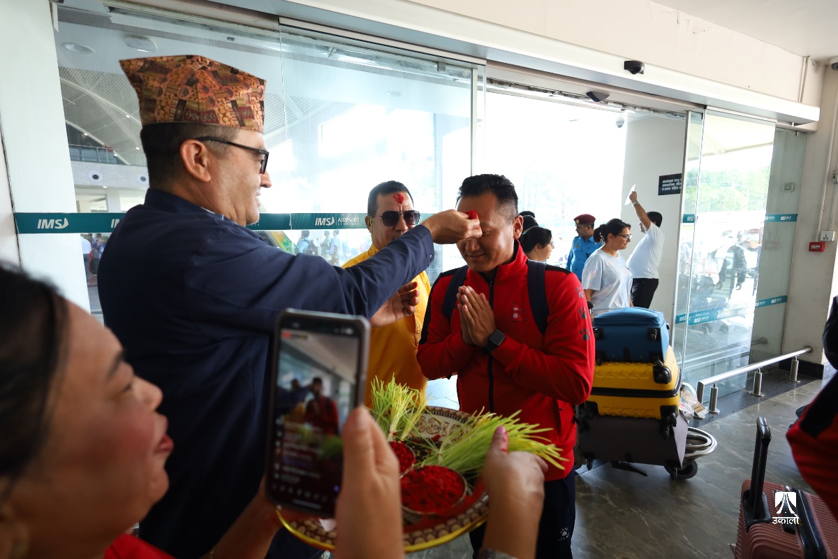 नेपाल भलिबल एसोसिएसनका पदाधिकारीले उपविजेता टोलीलाई खादासहित टीका–जमरा लगाएर विमानस्थलमा स्वागत गरेका छन्। शनिबार बेलुकी भएको फाइनलमा उज्बेकिस्तानसँग नेपाल ३–१ को सेटमा पराजित भएर उपविजेता बनेको हो।