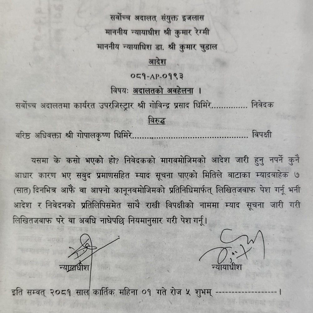 घिमिरेविरुद्ध सर्वोच्चका उपरजिस्ट्रार गोविन्दप्रसाद घिमिरेले अदालतको अवहेलनामा दिएको निवेदनका आधारमा सर्वोच्च अदालतमा मुद्दा अगाडि बढाइएको थियो। बिहीबार न्यायाधीशद्वय कुमार रेग्मी र कुमार चुडालको इजलासले सात दिनभित्र लिखित जवाफ पेश गर्न विपक्षी घिमिरेका नाममा आदेश दिएको छ।