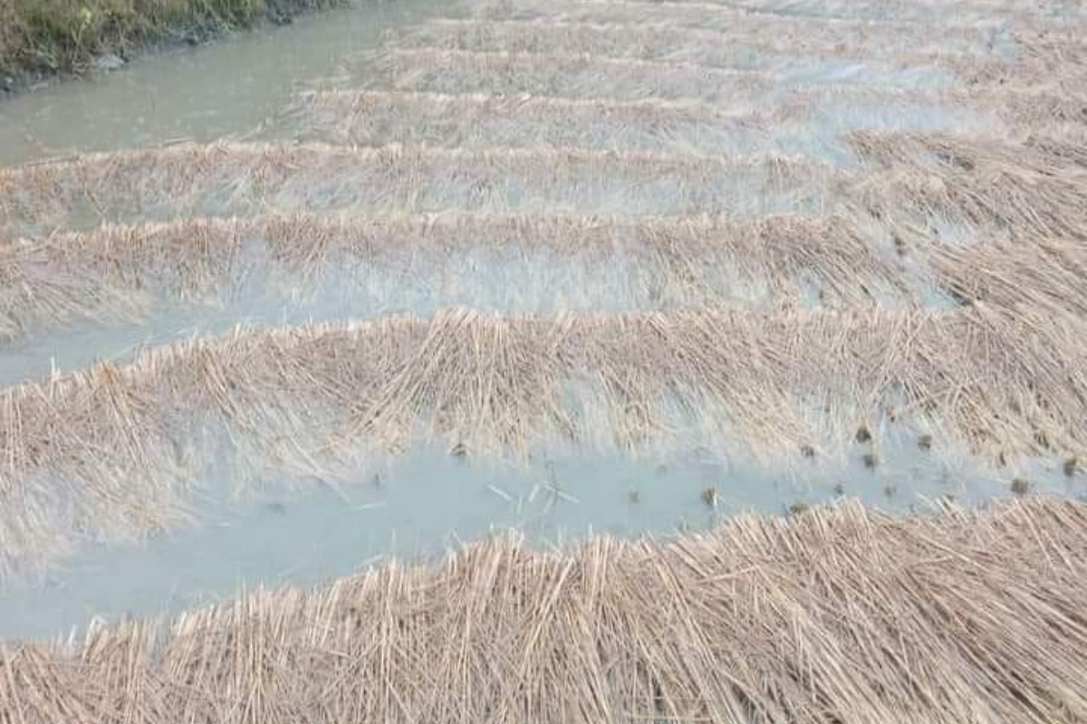 खेतमा काटेर सुकाएको धानको निहिन र पराल सोमबार र मंगलबारको वर्षाले डुबाएको किसानले बताएका छन्।