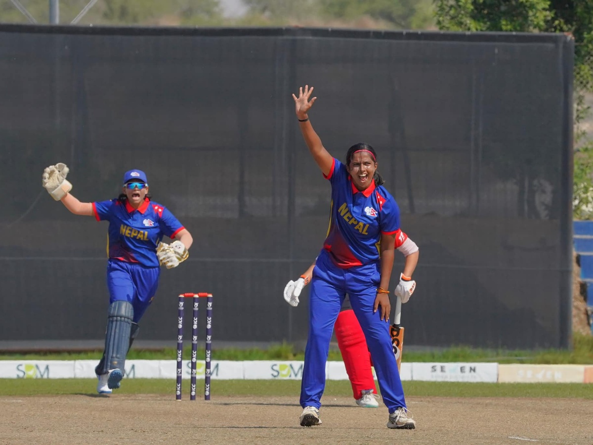 नेपालका रिया शर्माले ३ विकेट लिइन्। कप्तान पूजा महतो, कृष्मा गुरुङ तथा सिमाना केसीले समान १–१ विकेट लिए।