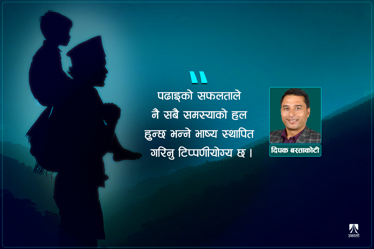 गन्धर्वलगायत तमाम दलित समुदायको किन जग्गा जमिन छैन र कसरी उपल्लो भनिएका समुदायमा संकेन्द्रित छ? किन पूर्णेसँग जति घर धाए पनि र जति कला-गला प्रयोग गरेपनि छोरालाई विद्यालयको ड्रेस-निलाे कपडा किनिदिन सक्ने हैसियत बन्दैन? दलितहरू गरिब किन भएका हुन् र यसैको पनि जगमा हुने तमाम थिचोमिचो, हेलाँहाेचाे कसरी विकास भयो? यी तमाम प्रश्नको अर्थ-सामाजिक-राजनीतिक संरचनामा नपसी शिक्षा लिनेबित्तिकै सबै समस्याको हल हुन्छ र शिक्षा लिएका मानिसले समाजमा उच्च स्थान हासिल गर्न सक्छन् भन्ने भाष्य स्थापित गर्न खोजिएको छ।