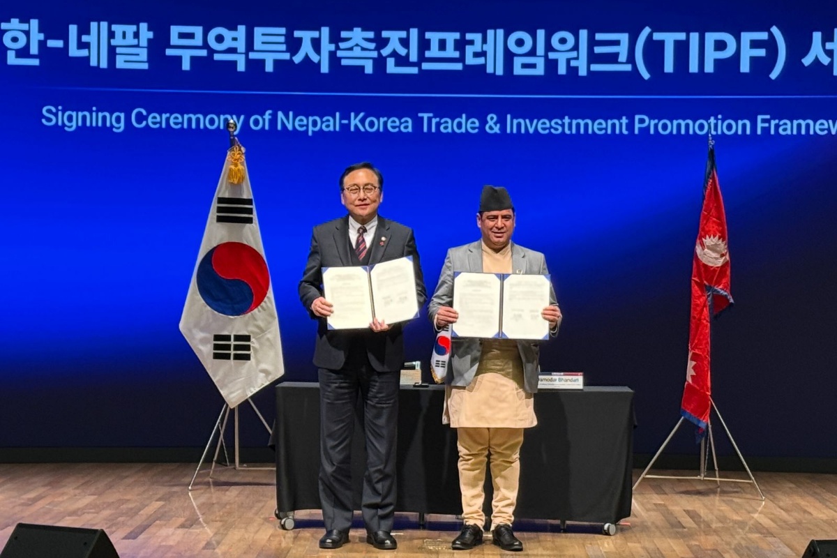 काठमाडौँ– उद्योग, वाणिज्य तथा आपूर्तिमन्त्री दामोदर भण्डारी र दक्षिण कोरियाका समकक्षी इन्क्यो च्योङबीच द्विपक्षीय व्यापार तथा लगानी प्रवर्द्धन फ्रेमवर्क (टीआईपीएफ) सम्झौतामा हस्ताक्षर भएको छ।
